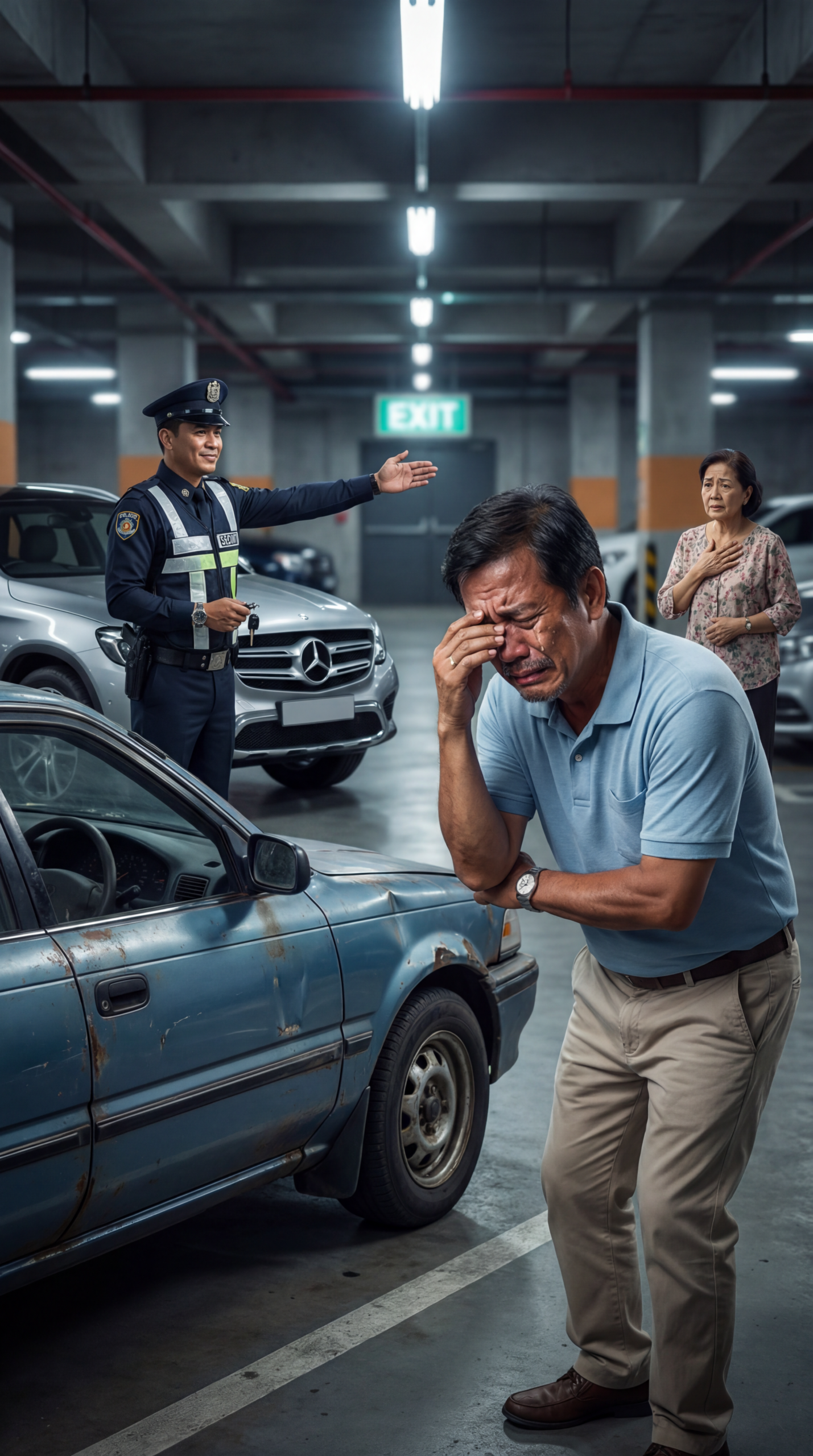 Sa ilalim ng malamig na ilaw ng basement parking—yung liwanag na parang hindi natutulog, diretsong tumatama sa semento at sa mga kotse—may isang lalaking nakatayo sa tabi ng lumang asul na sedan na punô ng kalawang at gasgas. Nakayuko siya, nakatakip ang isang kamay sa mata, at ang luha niya’y hindi na niya mapigilan. Para siyang piniga ng mundo sa iisang sulok, sa pagitan ng puting guhit ng parking line at ng pintong may maliwanag na “EXIT” sign sa dulo. Sa likod niya, isang security guard na naka-uniporme ang nakangiti pa habang itinuturo ang daan palabas—parang simpleng “paalisin mo na ’yan” lang ang nangyayari. At sa bandang kanan, may isang matandang babae na hawak ang dibdib, nanlalaki ang mata sa gulat at pag-aalala, habang sa gilid ng mga mamahaling sasakyan—isang kumikinang na puting luxury car—tumatambad ang kontrast na parang sinasadyang ipamukha: may mga taong pwedeng manatili, may mga taong dapat umalis.