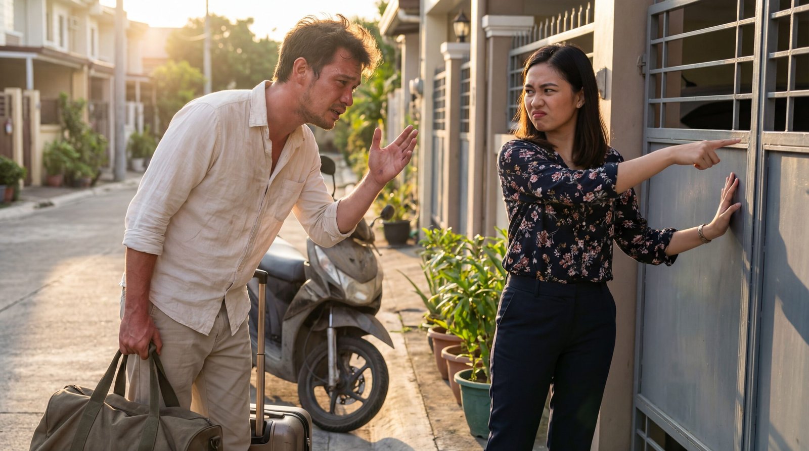 Kung may eksena mang mas masakit pa sa alon na sumasampal sa barko, iyon ang alingawngaw ng isang taong mahal mo na pinapaalis ka sa mismong tapat ng bahay na akala mo’y magiging tahanan mo. Hapon noon, golden hour—yung liwanag na dapat romantiko, pero sa kanila, naging spotlight ng kahihiyan. Sa isang tahimik na subdivision, may mga potted plants na nakaayos sa gilid ng gate at may motorsiklo sa background na parang tahimik na saksi, isang lalaki ang nakatayo na hawak ang maleta at duffel bag, parang dala niya ang buong buhay niya sa dalawang kamay. Gusot ang buhok, pawis ang noo, at may dumi sa damit na hindi dekorasyon—trabaho iyon, biyahe iyon, sakripisyo iyon. Sa harap niya, isang babae ang nakasandal sa gate, nakapamewang ang galit, at nakaturo palabas. Hindi siya umiiyak. Hindi siya nagdadalawang-isip. Ang mukha niya, puno ng pagkadiri—parang ang lalaking umuwi, hindi fiancé, kundi abala.