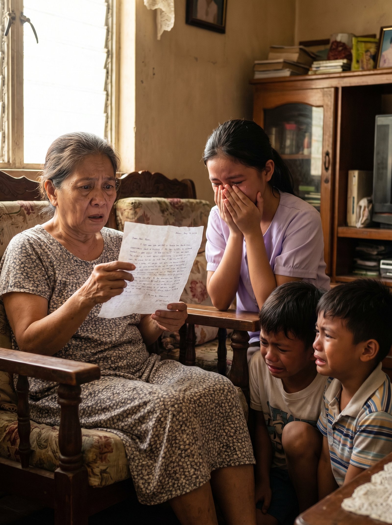 Nakaupo siya sa lumang upuang kahoy sa maliit nilang sala, katabi ang bintanang jalousie na pinapasok ang maputlang liwanag ng hapon. Sa gilid, naroon ang kabinet na puno ng lumang libro at alaalang matagal nang hindi ginagalaw. Sa harap niya, nanginginig ang sulat-kamay sa puting papel. Sa tabi niya, nakatayo si Mira, ang pinakamatandang apo, nakatakip ang dalawang kamay sa bibig para pigilin ang hikbi. Sa ibaba, nakaluhod sina Junjun at Baste, kapwa namumugto ang mga mata, kapwa umiiyak na parang hindi na alam kung saan ilalagay ang sakit.