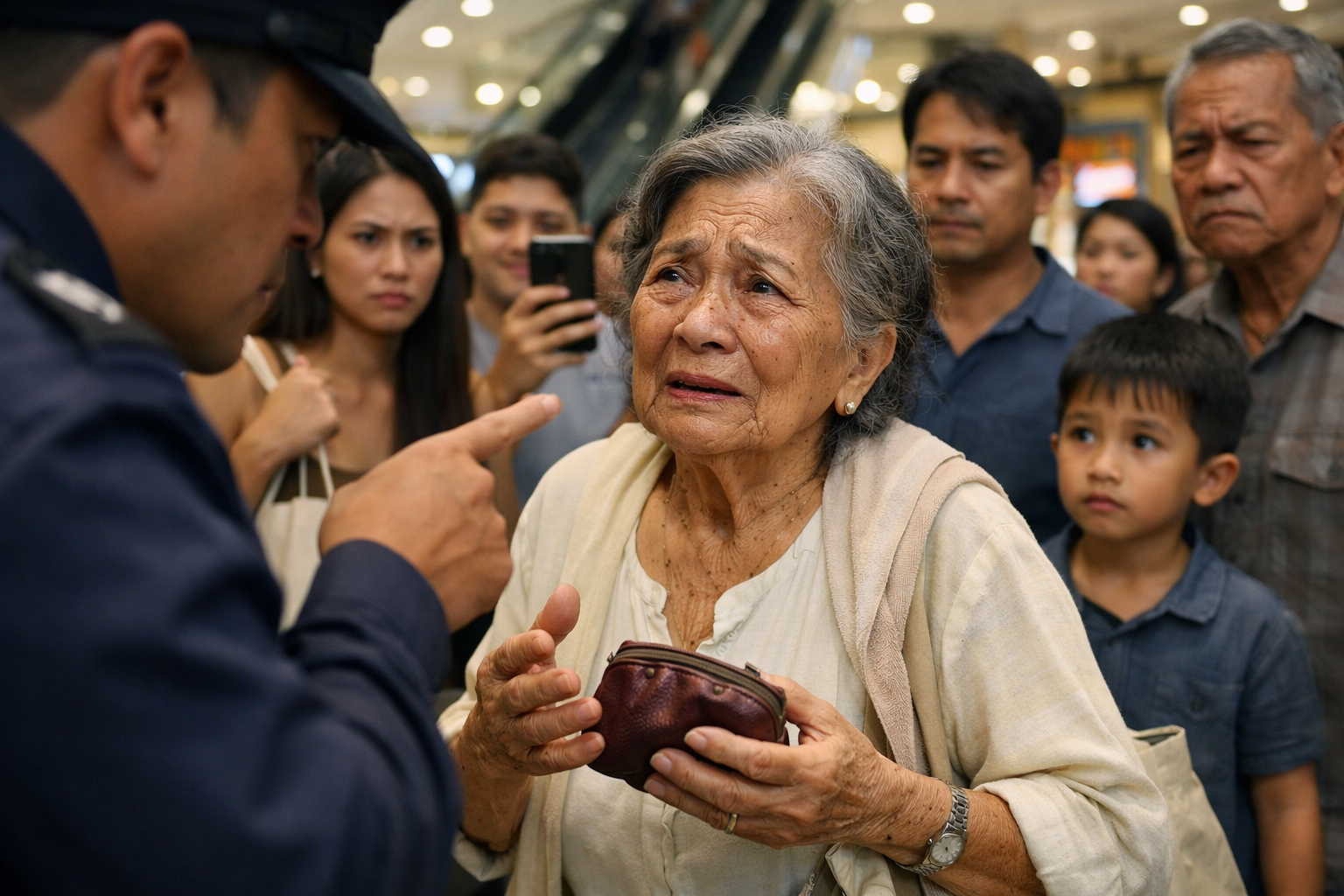 Sa gitna ng mall, nakapalibot ang mga tao na parang bilog ng usisero—may isang babaeng nakakunot ang noo, may lalaking seryoso ang mukha, may batang nakatingin na parang hindi maintindihan kung bakit umiiyak ang isang matanda, at may isang binata na nakataas ang cellphone, tahimik na nagre-record. Sa likod, umaakyat-bumaba ang escalator, tuloy ang ikot ng buhay, pero sa harap, natigil ang mundo sa isang matandang may kulubot na mukha at basang mata.