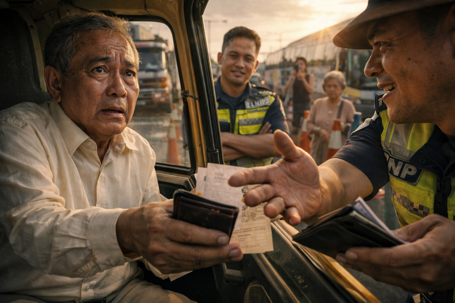 Sa loob ng isang lumang sasakyan na may bintanang bahagyang nakababa, nakaupo si Lolo Ruben. Puting buhok, kulubot ang noo, at nanginginig ang kamay sa paghawak ng pitaka. Suot niya ang simpleng long sleeves na halos kupas na sa kakalaba. Sa pagitan ng mga daliri niya, may mga papel—resibo, permit, at ilang dokumentong ginusot na sa kakahawak. Kita sa mata niya ang kaba, hindi dahil may kasalanan siya, kundi dahil alam niya ang laro sa kalsada: minsan, kahit kumpleto ka, hahanapan ka pa rin.