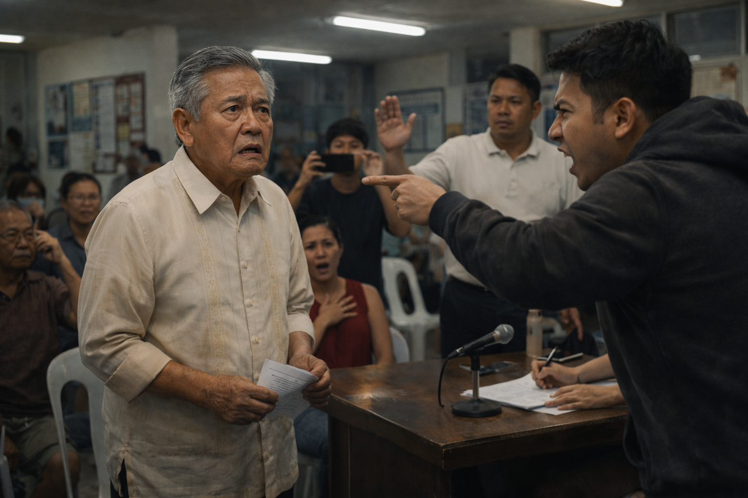 At sa sandaling iyon, parang lumaki ang barangay hall—hindi sa laki ng lugar, kundi sa bigat ng kahihiyan na ipinapasan sa isang taong halatang hindi sanay lumaban sa mikropono.