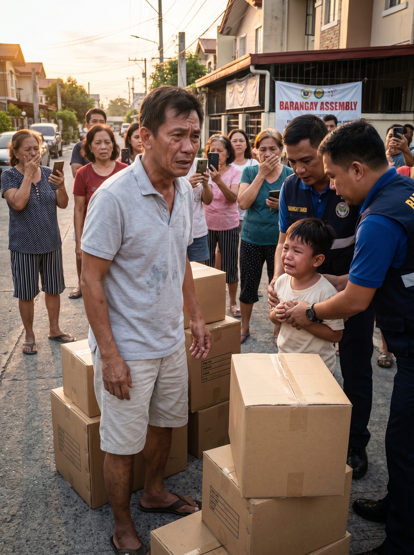 Hindi agad naintindihan ng mga tao kung alin ang mas masakit tingnan—ang batang umiiyak habang inaalalayan ng dalawang barangay tanod, o ang matandang lalaking nakatayo sa gitna ng kalsada na napapalibutan ng mga karton niyang kahon, parang biglang hindi alam kung saan siya lulugar. Sa tapat ng tarpaulin na may nakasulat na BARANGAY ASSEMBLY, tumama ang papalubog na araw sa mga mukha ng mga kapitbahay na naglabasan sa kani-kanilang gate, may hawak na cellphone, may takip ang bibig, may halatang hindi makapaniwala sa nangyayari.