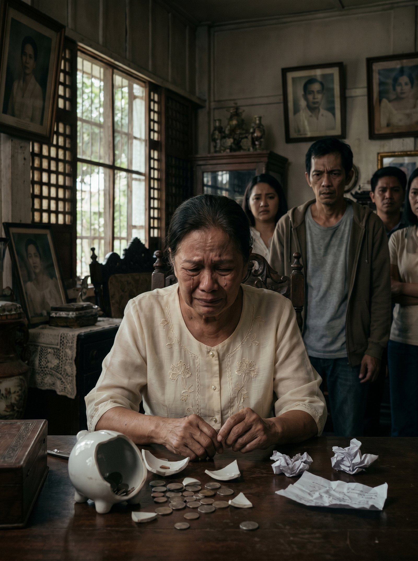 Hindi nakapagsalita si Lola Belen nang makita niya ang laman ng mesa sa gitna ng lumang bahay. Kakalapag pa lang niya ng bag mula sa probinsya, hindi pa man lubusang nakakahinga mula sa biyahe, nang mapansin niya agad ang basag na alkansyang nakatagilid sa ibabaw ng madilim na kahoy na lamesa. Nagkalat ang mga barya. May ilang piraso ng papel. May gusot na resibo. At sa gitna ng lahat ng iyon, para bang may iniwang sugat na hindi na puwedeng itago. Umupo siya sa silyang malapit sa mesa, suot pa rin ang puting blouse na pinagtiisan niya sa byahe, at nanginginig niyang hinawakan ang isang piraso ng basag na porselana. Sa paligid niya, tahimik ang lumang sala—ang malalaking bintana, ang kupas na dingding, ang mga lumang retrato ng mga yumao nilang kamag-anak na tila nakatingin mula sa taas, at ang mga anak at apo niyang nakatayo sa likod na hindi malaman kung paano sisimulan ang paliwanag.