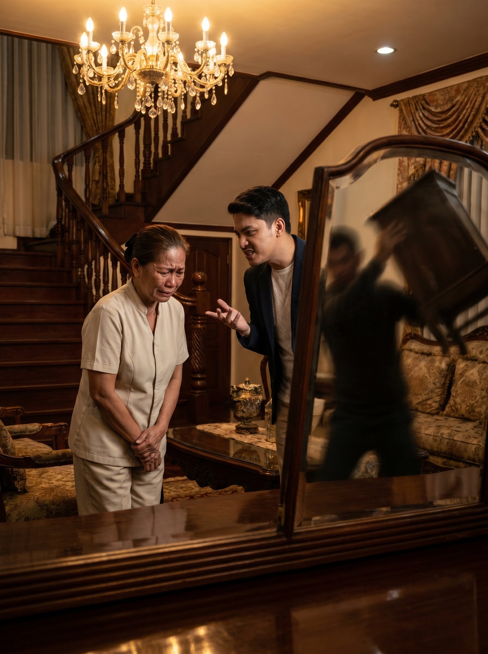Sa ilalim ng malaking kristal na chandelier, sa gitna ng maluwang na sala na may makintab na sahig, mabibigat na kurtina, at hagdang kahoy na paikot paitaas, nakatayo si Aling Nena na parang unti-unting nilalamon ng sariling hiya. Nakayuko siya, magkadikit ang mga kamay sa harap ng kupas niyang uniporme, at tahimik na umiiyak na para bang sanay na sanay na siyang pigilan ang sariling gumawa ng ingay kahit siya na ang dinudurog.