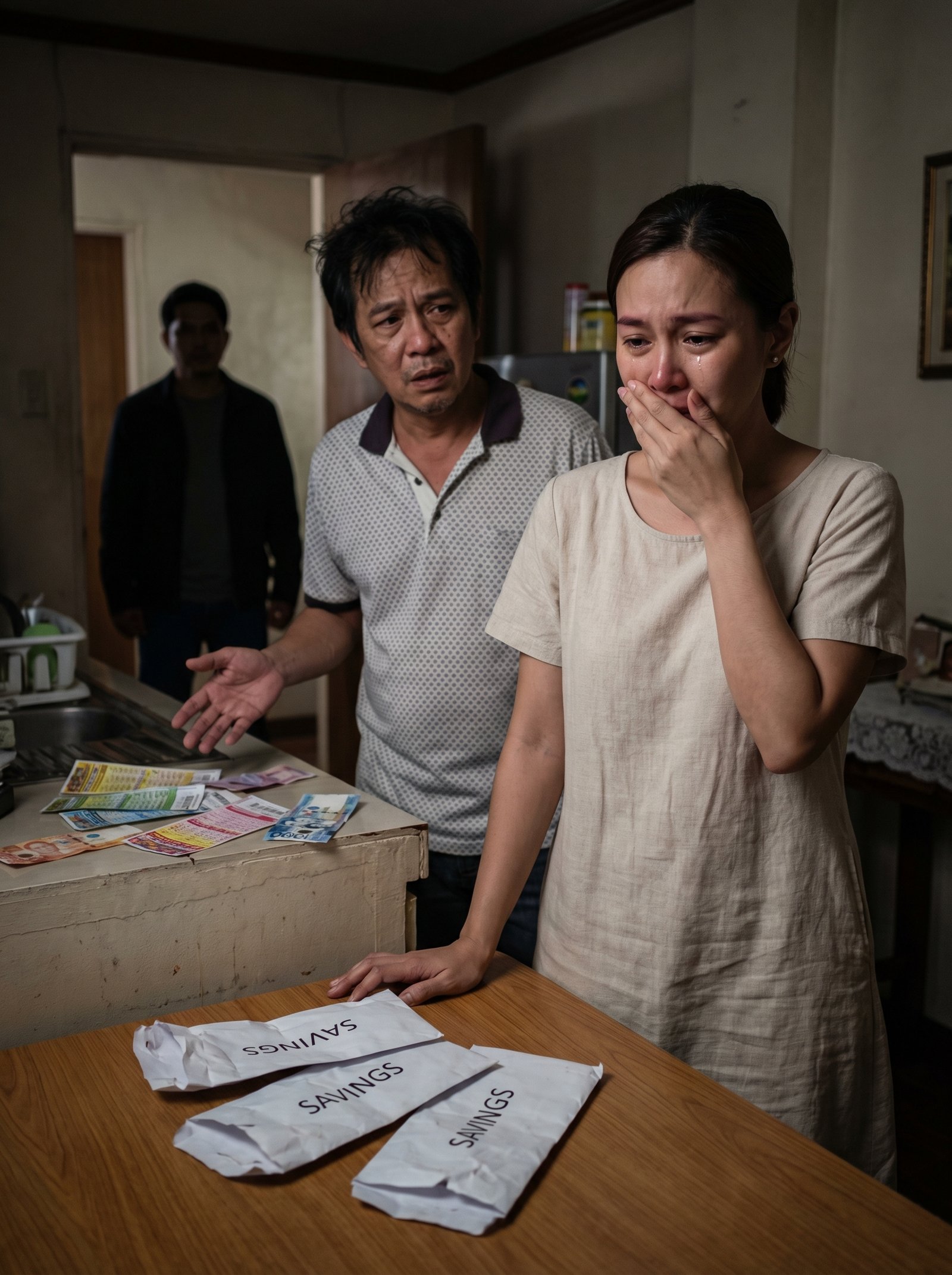 Hindi agad nakapagsalita si Mara nang makita niyang bukas na ang tatlong puting sobre sa ibabaw ng lumang mesa. Pare-pareho ang sulat sa bawat isa. SAVINGS. SAVINGS. SAVINGS. Para bang sinadya ng tadhana na ipaulit-ulit sa kanya ang salitang matagal niyang iningatan, matagal niyang binuo sa pagtitipid, sa paglalaba ng sariling kamay, sa paulit-ulit na pagtanggi sa sariling luho, sa bawat baryang isiniksik niya sa gilid ng kahon kapag tulog na ang lahat. Ngunit ngayong gabi, ang salitang iyon ay wala nang laman. Gusot ang mga papel. Nakabuka ang mga bunganga ng sobre na parang tatlong sugat na sabay-sabay bumuka sa harap niya. Sa kusina, sa tabi ng lababo, nakakalat ang ilang perang papel at mga piraso ng ticket na hindi na kailangang ipaliwanag. Kita ang numero. Kita ang kulay. Kita ang kasalanan.