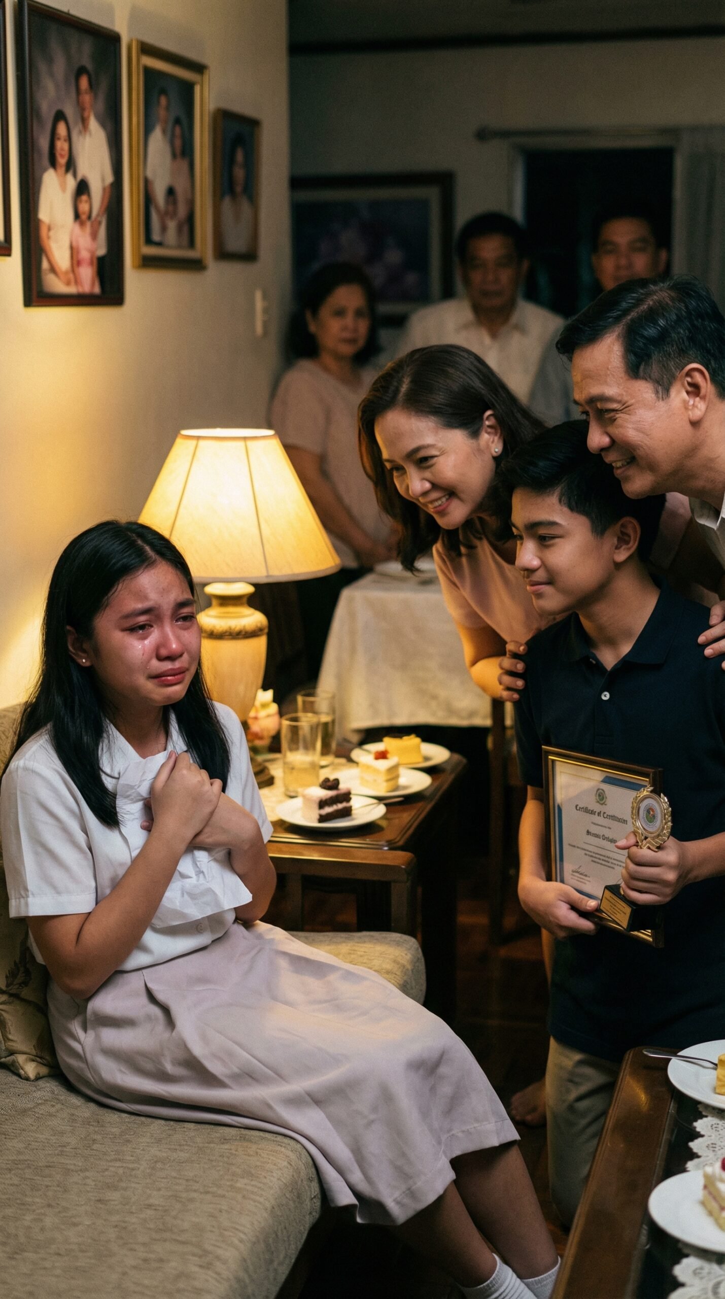 Sa unang tingin, parang masayang gabi lang ito sa loob ng bahay—may ilaw ng lampshade na mainit sa mata, may mesa na may cake at basong kalahati ang laman, at sa dingding, mga retratong naka-frame na parang paalala ng “pamilya tayo.” Sa gitna, may batang lalaki na hawak ang plaka at tropeo, nakangiting pilit pero proud, habang ang mga magulang ay nakayuko sa kanya, masaya, parang ang buong mundo umiikot sa medalya. Pero sa kaliwa, may isang bagay na hindi tugma sa salitang “celebration”: isang dalagitang nakaupo sa sofa, yakap ang dibdib, umiiyak nang tahimik—parang bawat palakpak para sa kapatid, may kasamang suntok sa puso niya. At ang tanong ay isa lang—gaano katagal mo kayang paboran ang “matalino” kung sa bandang dulo, yung tinawag mong “bobo” pala ang magbubuhat sa’yo palabas ng hirap?
