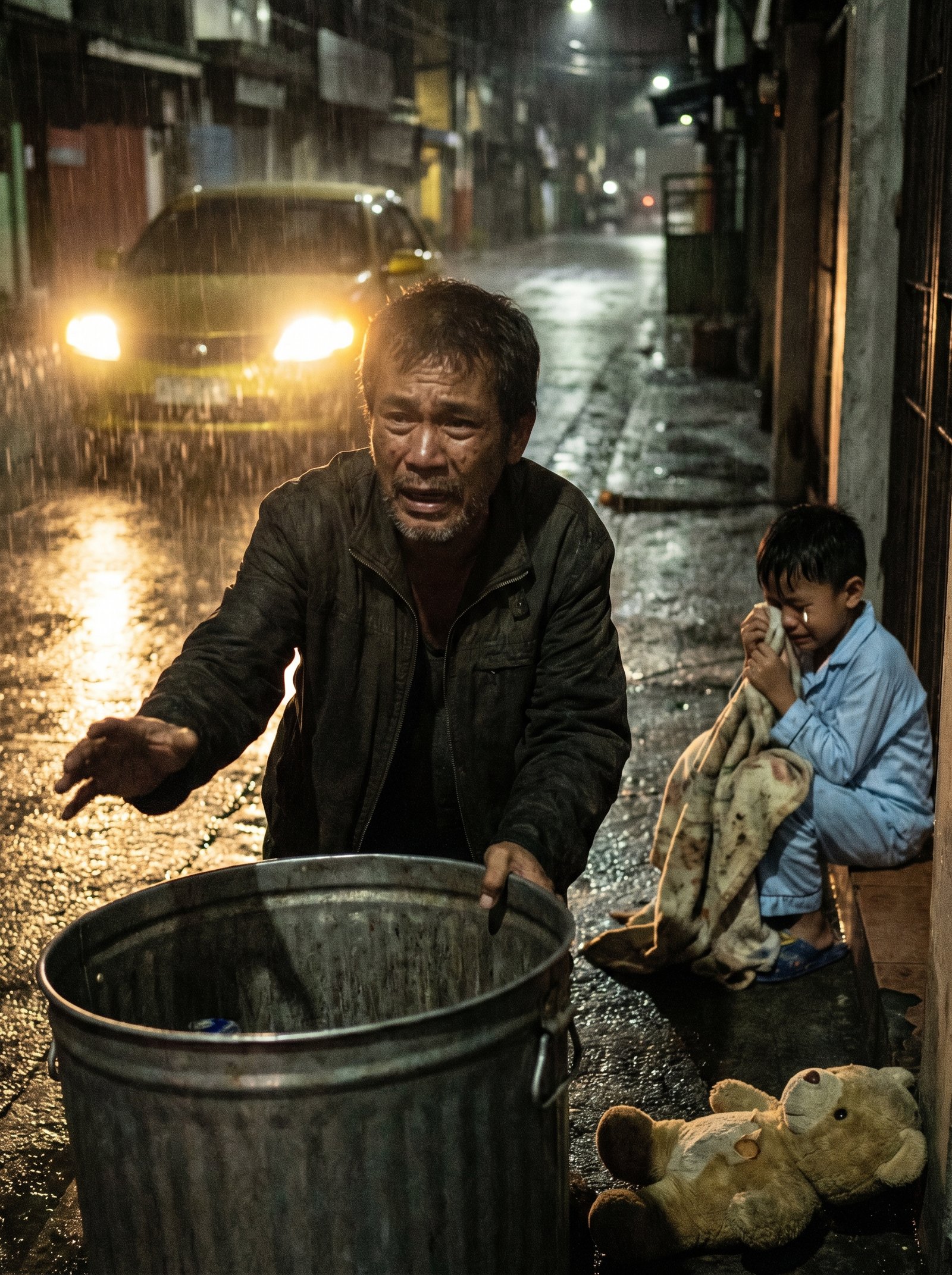 Lumapit siya, inagaw ang laruan, at kahit umiiyak na si Niko at nakahawak sa laylayan ng shirt niya, dumiretso siya sa labas. Malakas ang ulan. Madilim ang eskinita. Ang malaking basurahan sa gilid ng daan ay bukas ang bibig na parang matagal nang naghihintay ng kung anong itatapon.