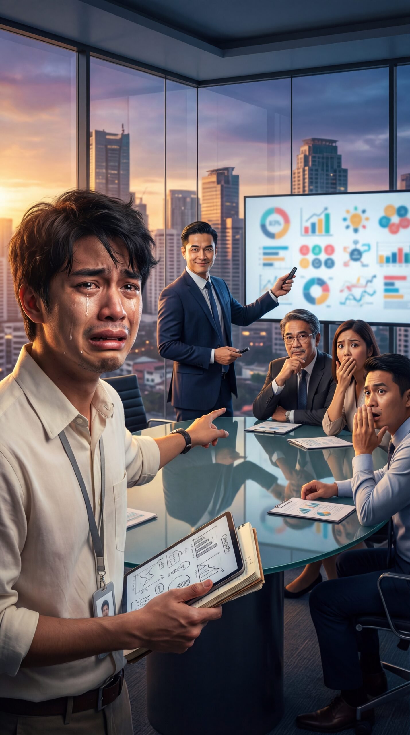 May mga luha na hindi galing sa kabiguan—galing iyon sa kawalan ng katarungan. Sa larawang ito, isang empleyadong nakasuot ng puting polo at ID lace ang nakatayo sa gilid ng conference room, luha ang umaagos sa pisngi habang hawak ang folder na punô ng notes at drafts. Nakaduro siya sa loob ng meeting, hindi para manumbat lang, kundi parang pilit ipakita ang katotohanan. Sa harap ng salaming mesa, may manager na naka-suit na nakangiti habang nagpe-present sa malaking screen na punô ng charts at graphs, parang kanya ang ideya. Sa kabilang dulo, may mga kasamahang nakaupo—may nanlaki ang mata, may napasapo sa bibig, may napayuko sa gulat—habang ang sunset city skyline sa likod ng salamin ay parang nanonood din. Ang tanong ay isa lang: hanggang kailan mo lulunukin ang ideyang ninakaw—bago mo ipaglaban ang pangalan mo?