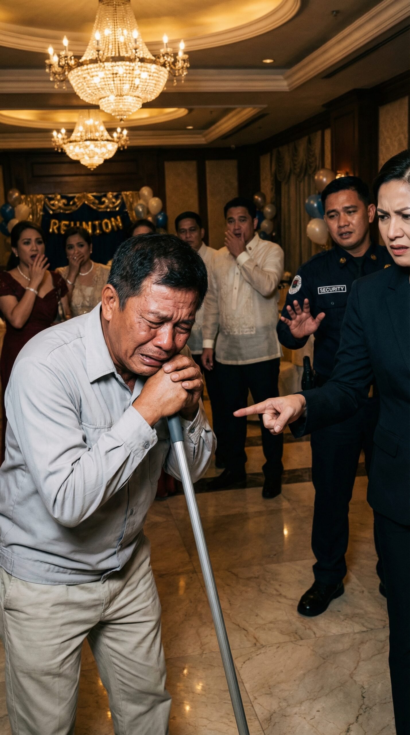 Sa ilalim ng kumikislap na chandelier at ginintuang ilaw ng bulwagan, may isang taong hindi dapat umiiyak—pero umiiyak. Hindi dahil lasing. Hindi dahil drama. Kundi dahil pinamukha sa kanya, sa gitna ng “reunion” na dapat masaya, na hindi siya kabilang. Sa eksaktong sandaling iyon, habang ang marmol na sahig ay sumasalamin sa mga sapatos na mamahalin at may banner sa likod na nakasulat ang salitang REUNION, isang janitor ang nakayuko—magkapatong ang mga kamay sa hawakan ng mop, parang iyon na lang ang sandalan ng dignidad. Sa harap niya, isang manager ang nakaturo, nakakunot ang noo, at may boses na parang may karapatang magtaboy. Sa likod, may security na nakaalalay, at mga bisitang nakatakip ang bibig sa gulat. Ang tanong: sino ang tunay na marangal—ang naka-suit, o ang taong tahimik na tumulong?