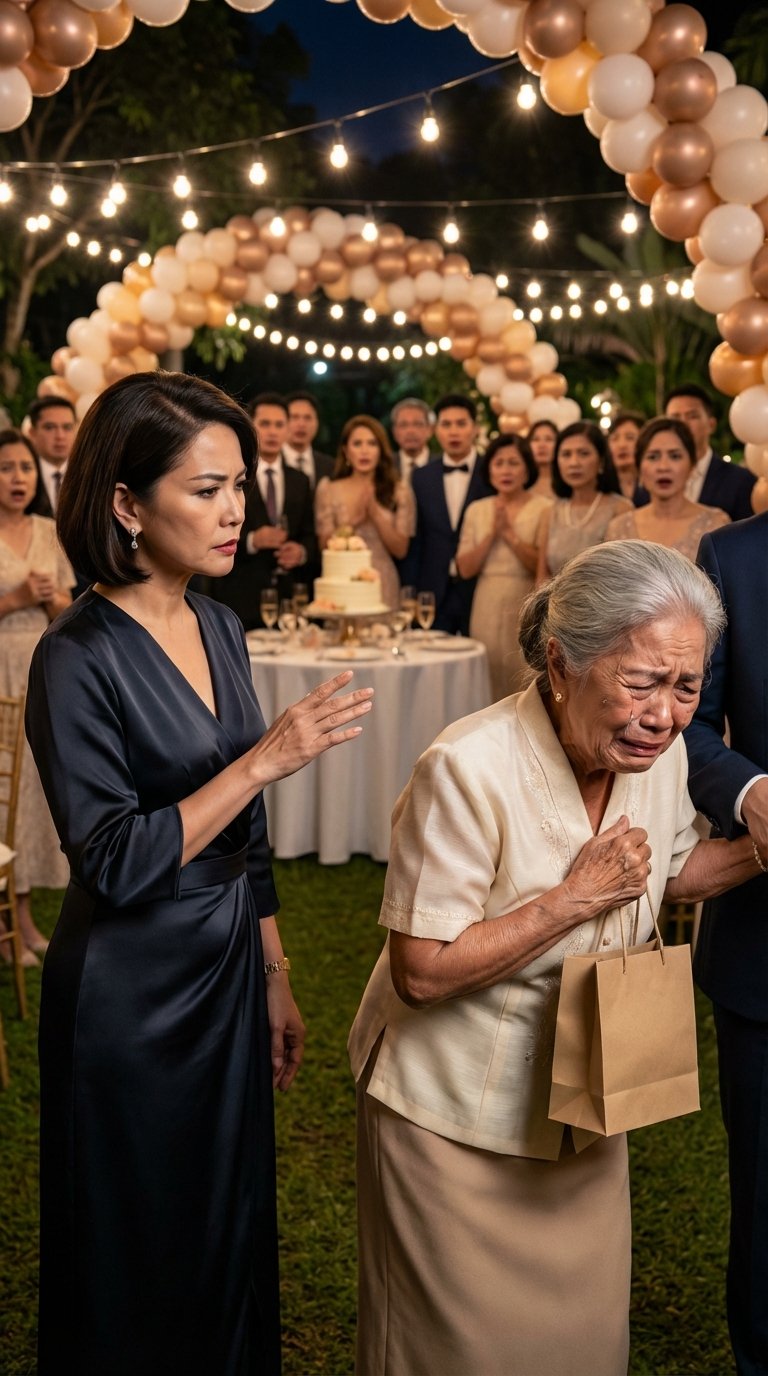 Hindi na maalala ni Aling Rosa kung paano siya napunta sa gitna ng damuhan. Ang alam lang niya, ilang sandali lang ang nakalipas ay nakatayo pa siya sa gilid ng hardin, hawak ang maliit na paper bag na may lamang simpleng regalo, at ngayo’y tila nakaharap na siya sa buong handaan na parang siya pa ang pinakamalaking kahihiyan sa gabing iyon. Sa ibabaw nila, kumikislap ang sunod-sunod na bumbilya. Sa paligid, may mga puti at gintong lobo na bumubuo ng mga arko. Sa gitna ng mga mesa, may birthday cake na nakapwesto sa likod, napapalibutan ng mga bisitang nakaayos at nakapormal. Dapat sana’y masaya ang gabi. Dapat sana’y punong-puno ng bati, tawanan, at litrato.
