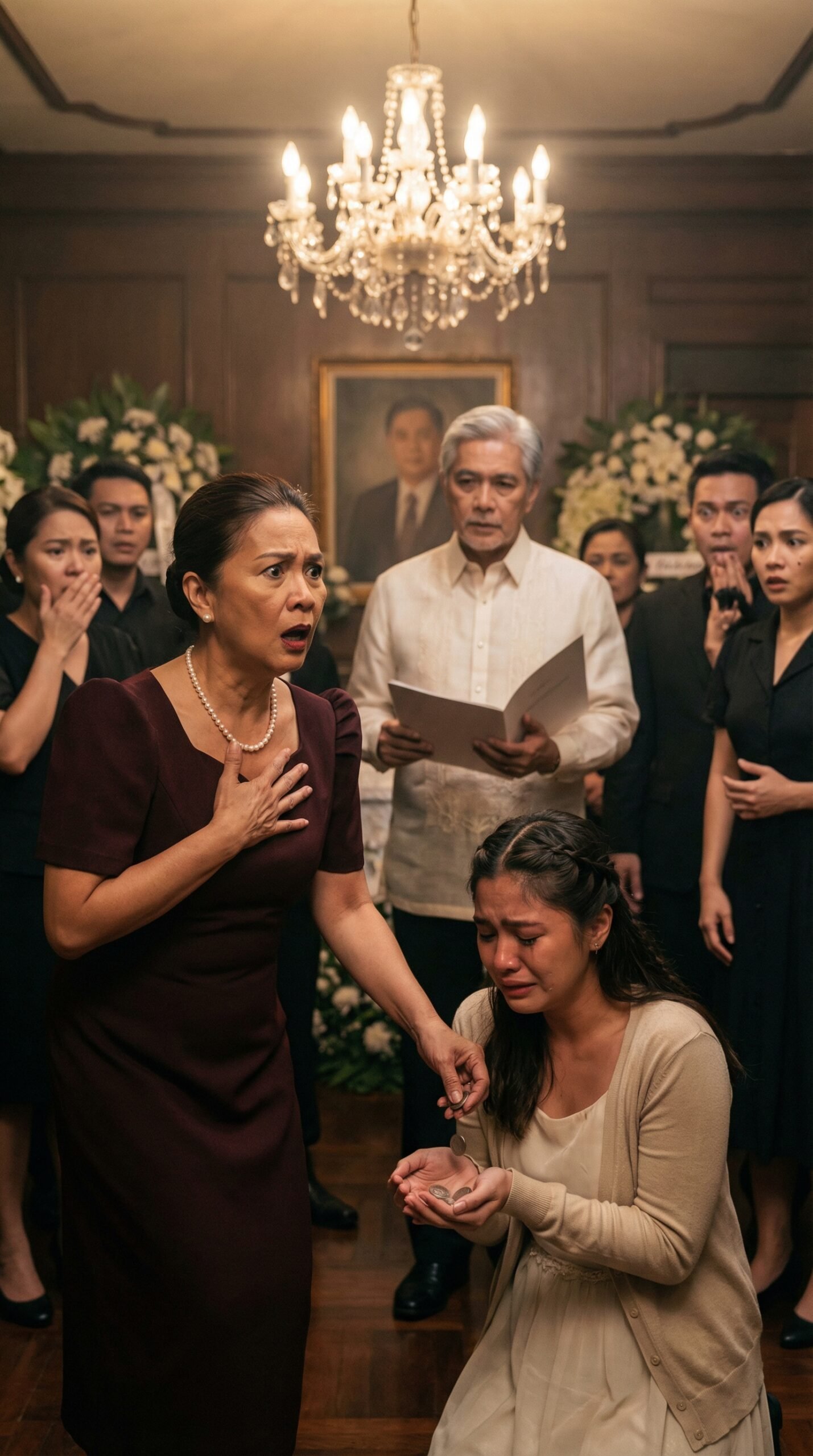Si Attorney Ramon ay nanatiling nakatayo, hawak ang testamento na tila ngayon lamang nagaan ang bigat. Sa likod niya, ang larawan ni Don Esteban ay nananatiling tahimik, ngunit sa gabing iyon, parang mas malinaw ang presensya nito kaysa sa lahat ng buhay sa silid. Ang mga puting bulaklak, ang ilaw ng chandelier, ang makintab na sahig, ang itim na kasuotan ng mga nakikiramay—lahat ng iyon ay naging saksi sa isang baligtarang hindi inaasahan ng sino man.