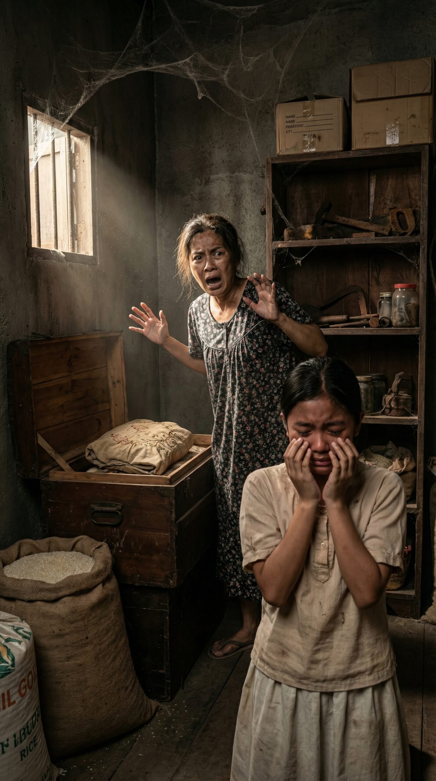 Nasa loob ang bodega. Madilim. Makipot. Maalikabok. May sinag ng ilaw na pumapasok sa maliit na bintanang may rehas, at sa guhit na iyon ng liwanag, makikita ang alikabok na lumulutang na parang mga kaluluwang hindi makaalis. May sapot ng gagamba sa kisame, may lumang estante na puno ng kinakalawang na lagari at bote, may sako ng bigas sa gilid, at sa tabi nito ay isang malaking kahoy na baul na kupas na ang kulay.