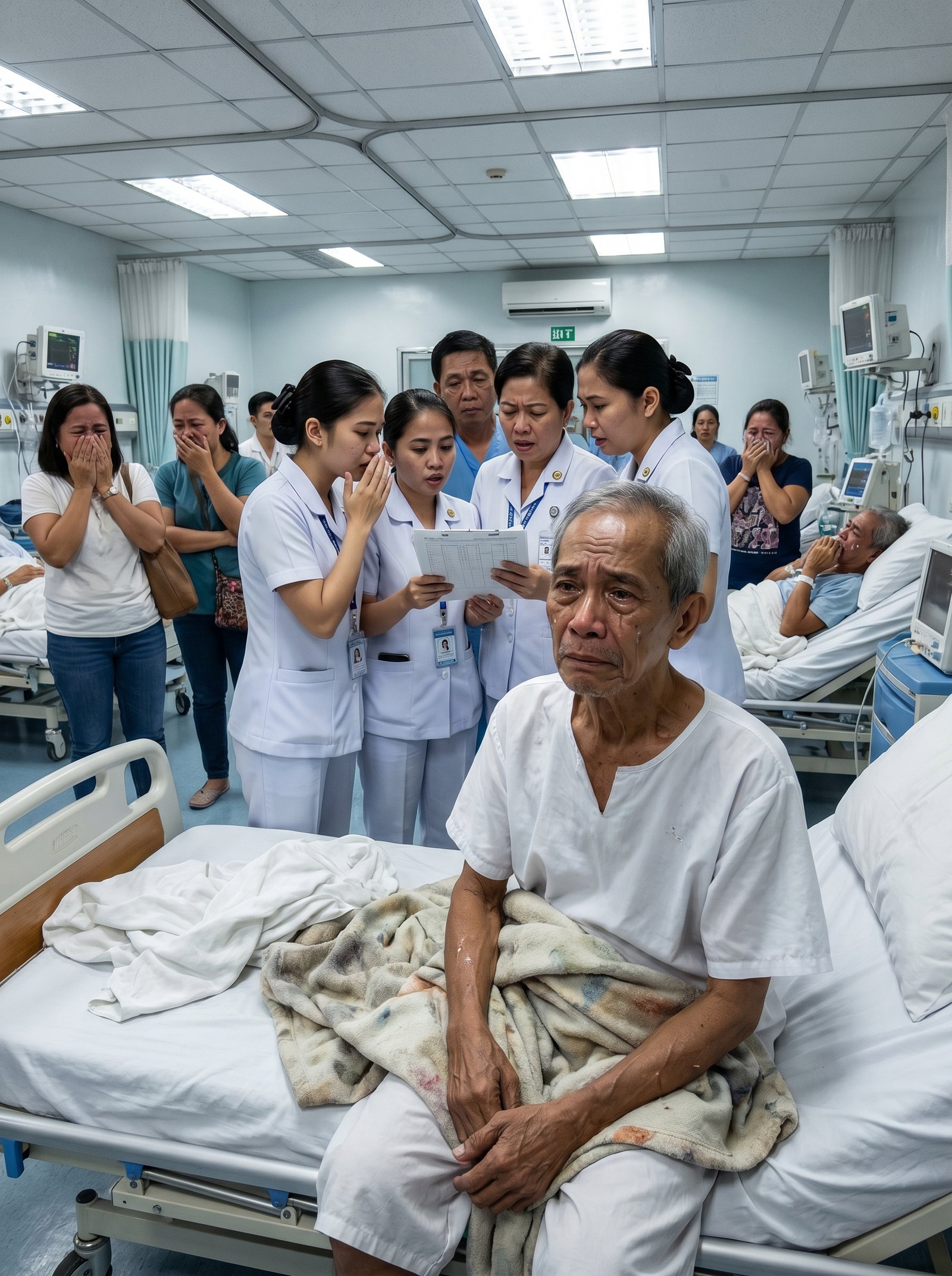 Sa gilid ng ward, may isang babaeng bantay na napasandal na lang sa pader sa sobrang iyak. Ang isa pang pasyente sa likurang kama ay nakatakip ang kamay sa mukha. At sa gitna ng mapuputing ilaw, mga kumot, monitor, at tunog ng ospital, isang matandang pasyenteng akala ng lahat ay walang kamag-anak ang naging dahilan ng pagluha ng buong silid.