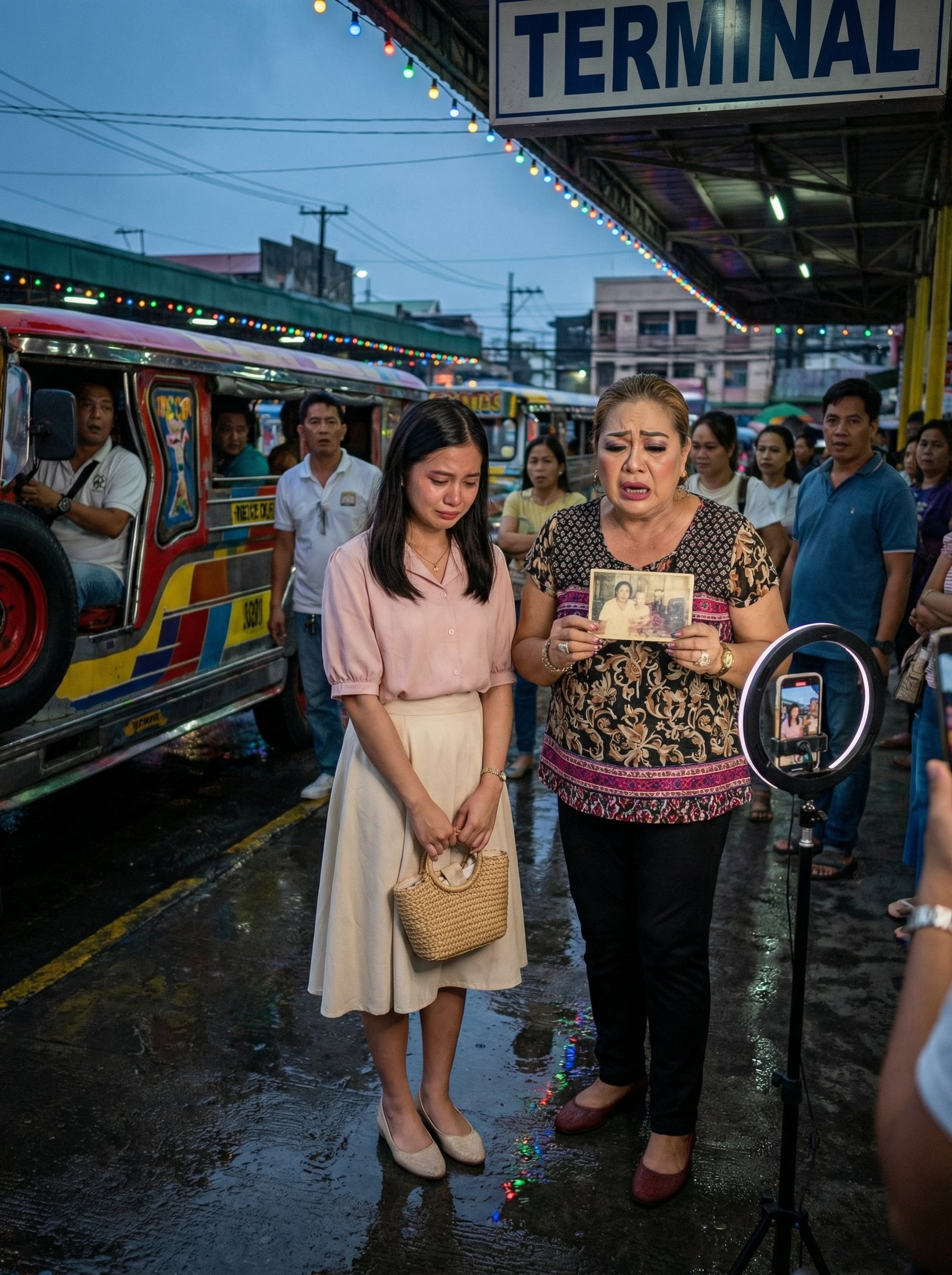 Sa ilalim ng malaking karatulang TERMINAL, sa gitna ng basang sementong kumikislap sa kulay ng mga ilaw at sa pagitan ng mga jeep na bagong dating mula sa ulan, tahimik na nakatayo si Nina habang yakap ang maliit niyang bayong. Maputla ang blouse niya. Maayos ang tiklop ng palda niya. Bahagyang yuko ang ulo niya, hindi dahil may ginawang masama, kundi dahil sanay siyang umiwas sa gulo. Sa paligid niya, umaalingawngaw ang boses ng mga konduktor, ang kalansing ng barya, at ang mumunting talsik ng tubig mula sa mga gulong.