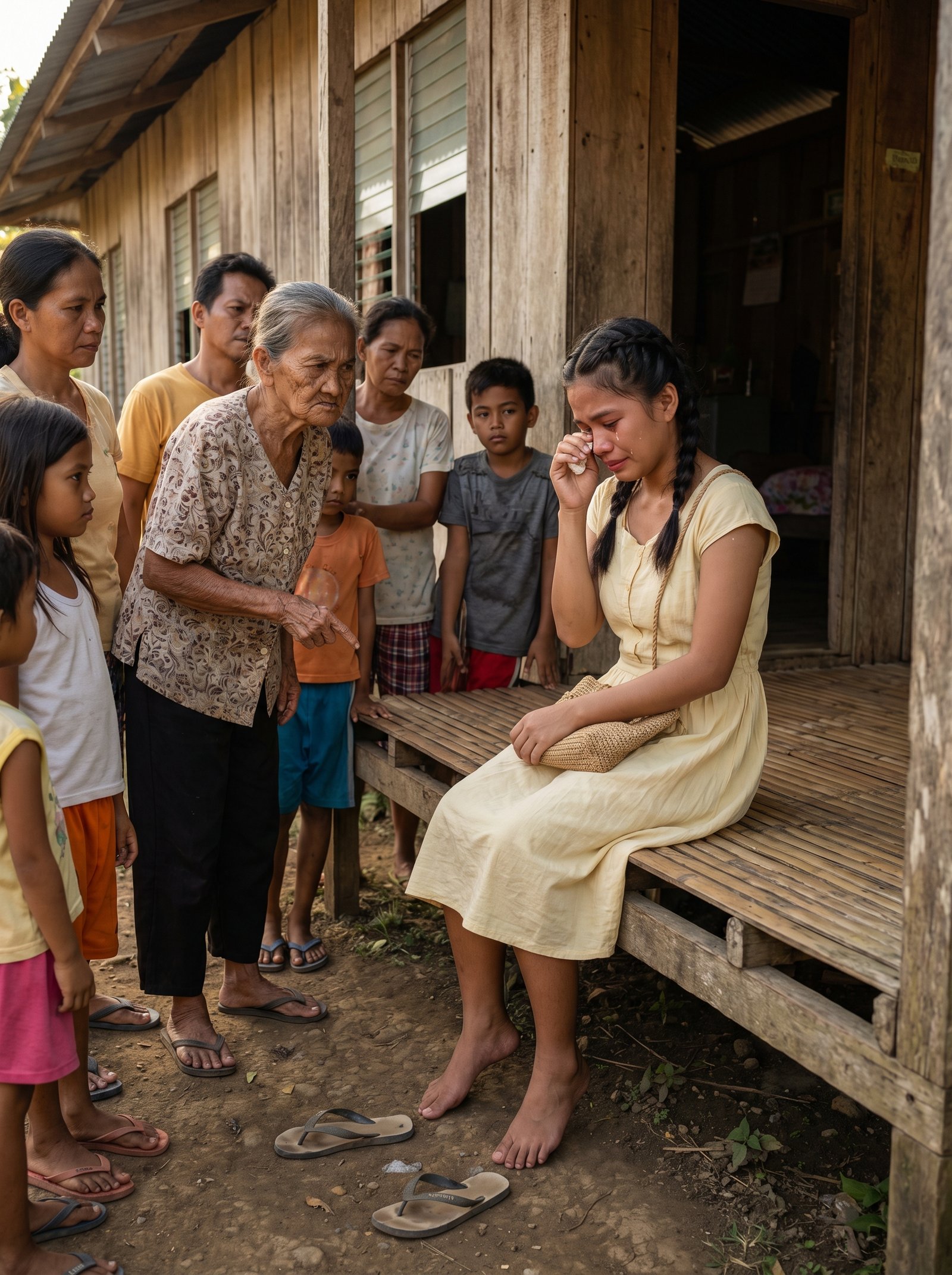 Mainit pa ang lupa kahit papahapon na. Tahimik ang paligid, pero ang katahimikan ay hindi payapa. Mabigat ito. Mapanuri. Nakatingin. Sa isang tabi, ang dalawang tsinelas niya ay naiwang nakahandusay sa lupa, parang patunay ng mahabang lakad na dinaanan niya para lang makarating sa bahay na iyon. Sa harap niya, nakatayo si Lola Seling, payat ngunit matigas ang mukha, at ang daliri nitong nakaturo sa kanya ay parang mas matalim pa sa anumang salita.