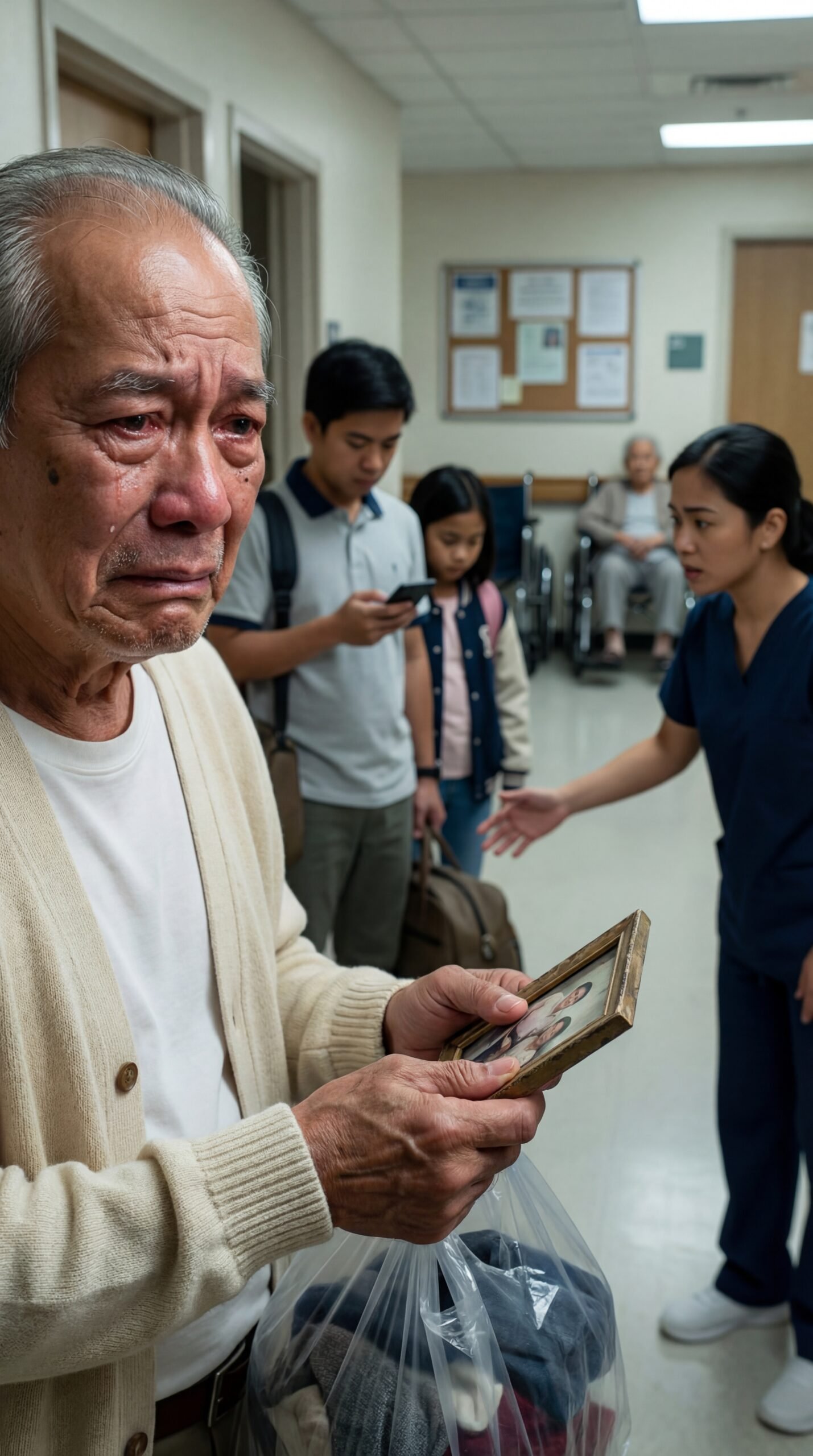 Sa malamig na hallway ng isang home for the aged na amoy gamot at lumang antiseptic, may isang matandang lalaki ang nakatayo sa gilid na parang nawalan ng lugar sa mundo. Namumugto ang mata niya, basang-basa ang pisngi, at nanginginig ang labi habang nakatitig sa isang lumang framed photo na hawak niya sa dalawang kamay—parang doon na lang siya kumakapit para hindi tuluyang bumagsak. Sa kabilang kamay, may dala siyang plastik na supot na puno ng iilang damit, tiklop-tiklop na parang minadali, parang itinabi na lang. Sa likod niya, may dalawang batang halos hindi na bata—isang binatilyong abala sa cellphone at isang dalagitang tahimik na nakatingin sa sahig—at sa kanan, isang nurse na naka-scrubs ang nakaunat ang kamay, parang nagmamadaling ipaliwanag ang proseso habang nagkakagulo ang emosyon sa hangin. Sa dulo ng hallway, may wheelchair, may bulletin board na puno ng paalala, at may mga matang hindi nakikialam dahil sanay na sa ganitong tagpo: isang ama na iniiwan, at mga anak na kunwari may rason.