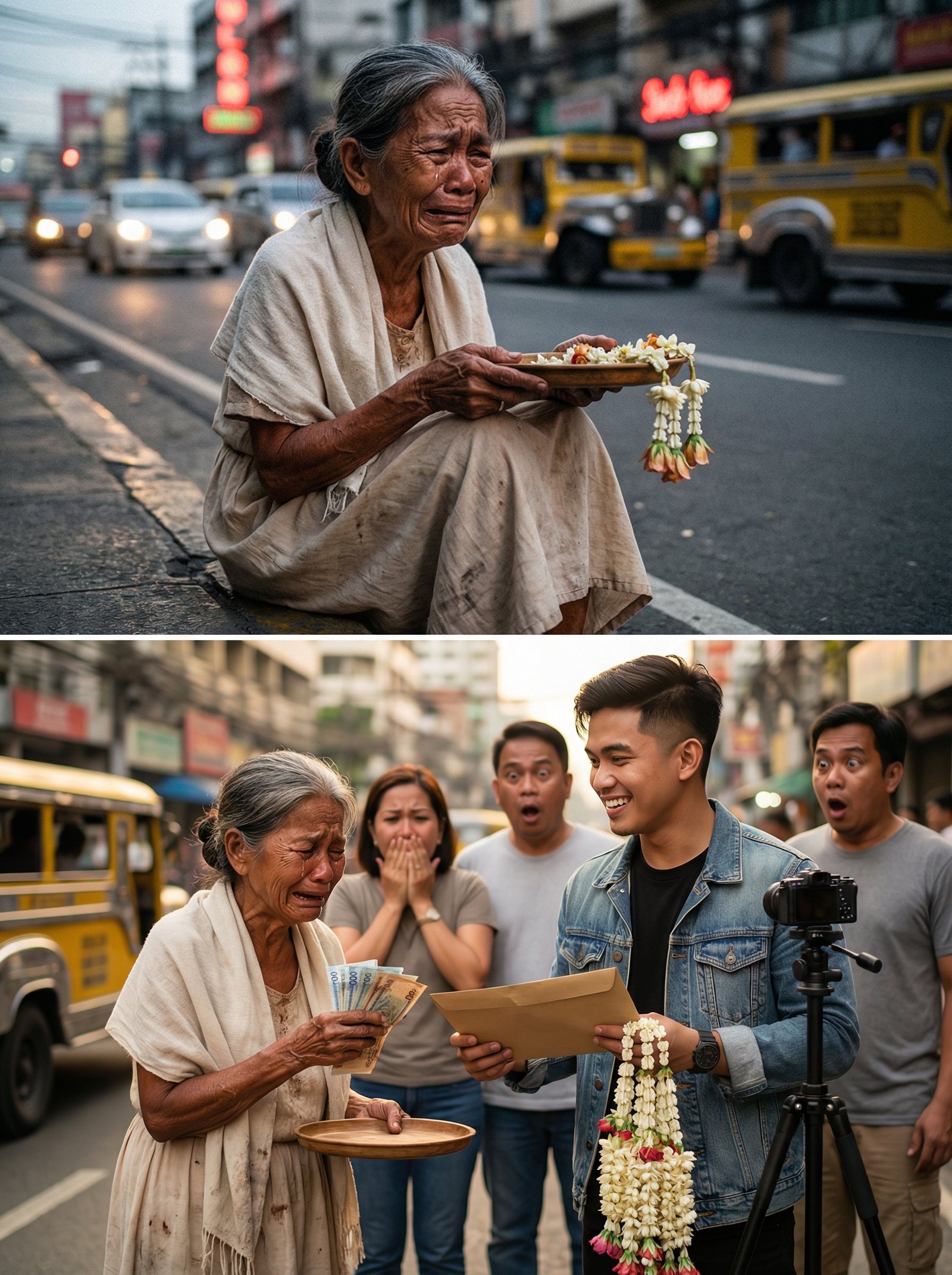 Sa pinaka-maingay na kalsada, doon madalas pinakamaririnig ang pinakatahimik na pagdurusa—yung iyak na walang humahawak, yung pakiusap na nilulunod ng busina. Sa gilid ng aspalto, habang dumadaan ang mga sasakyan at jeep na parang walang katapusan, may isang matandang babae ang nakaupo, yakap ang pagod, hawak ang isang bilao ng sampaguita. Namumugto ang mata niya, nanginginig ang labi, at ang luha niya’y hindi na lang dahil sa hirap—kundi dahil pakiramdam niya, wala nang natitirang oras para umasa.