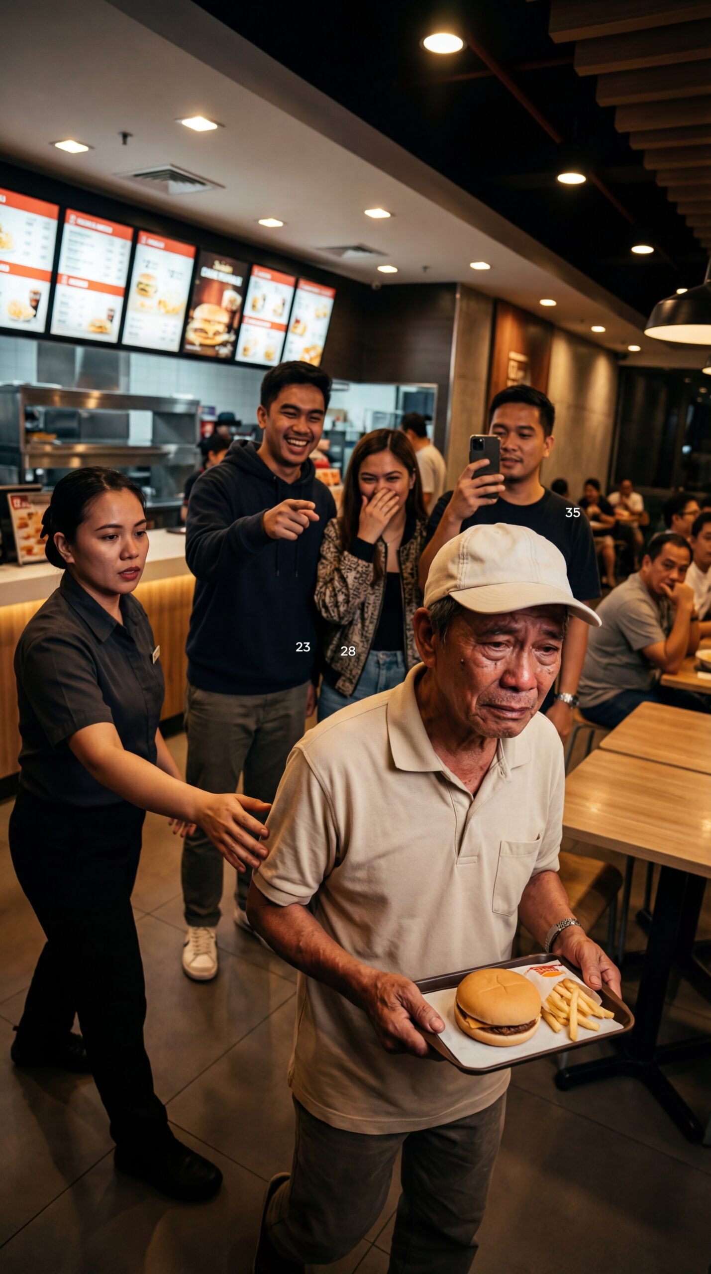 May mga luha na hindi dahil sa gutom—kundi dahil sa hiya. Sa loob ng maliwanag na fast food na amoy pritong manok at bagong lutong fries, may isang matandang lalaki ang dahan-dahang naglalakad sa pagitan ng mga mesa, bitbit ang tray na may burger at fries. Hindi siya nagmamadali. Hindi siya maingay. Pero ang mukha niya, parang pinipigilan ang isang bagay na matagal nang gustong bumagsak. Sa gilid niya, may empleyadang nakalahad ang kamay na tila gustong umalalay—habang sa likod, may mga kabataang nagtatawanan, nagtuturo, at may isang lalaking nakataas ang cellphone, kinukunan pa ang kanyang paglalakad na para bang palabas ang kahihiyan.