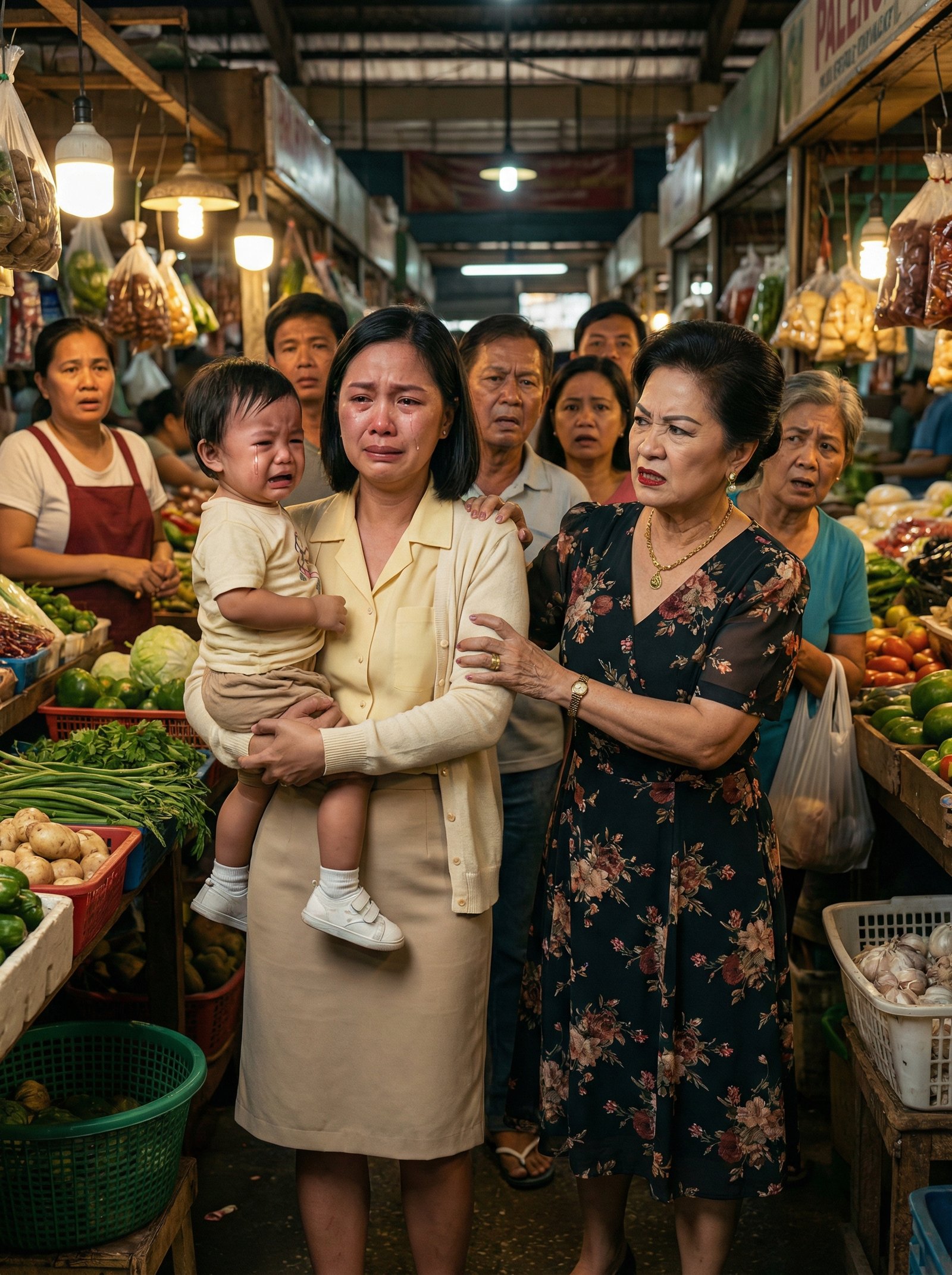 Sa gitna ng masikip at maingay na pasilyo ng palengke, sa ilalim ng mga bombilyang nakasabit sa kisame at sa pagitan ng mga gulay, bawang, sibuyas, at basang sahig na inaapakan ng nagmamadaling tao, nakapila si Mara habang mahigpit na karga ang batang halos hindi na tumitigil sa pag-iyak. Namumugto ang mga mata niya, hindi lang sa pagod kundi sa hiya at gutom na ilang oras na niyang nilulunok. Ang bata sa bisig niya ay mainit ang noo, namimilipit sa iyak, at paulit-ulit na sumisiksik sa dibdib niya na para bang doon lang nito nararamdamang ligtas ang mundo. Sa kabilang gilid ng pila, nakatayo si Doña Celestina Villanueva—plantsada ang buhok, mamahalin ang floral na bestida, matigas ang tingin, at sanay na agad gumagalaw ang tao kapag siya ang nagsalita. Isang tingin lang niya sa gusot na cardigan ni Mara, sa luma nitong tsinelas, at sa batang umiiyak sa kandungan nito, parang nakapagpasya na siya kung anong klaseng tao ang nasa harap niya.