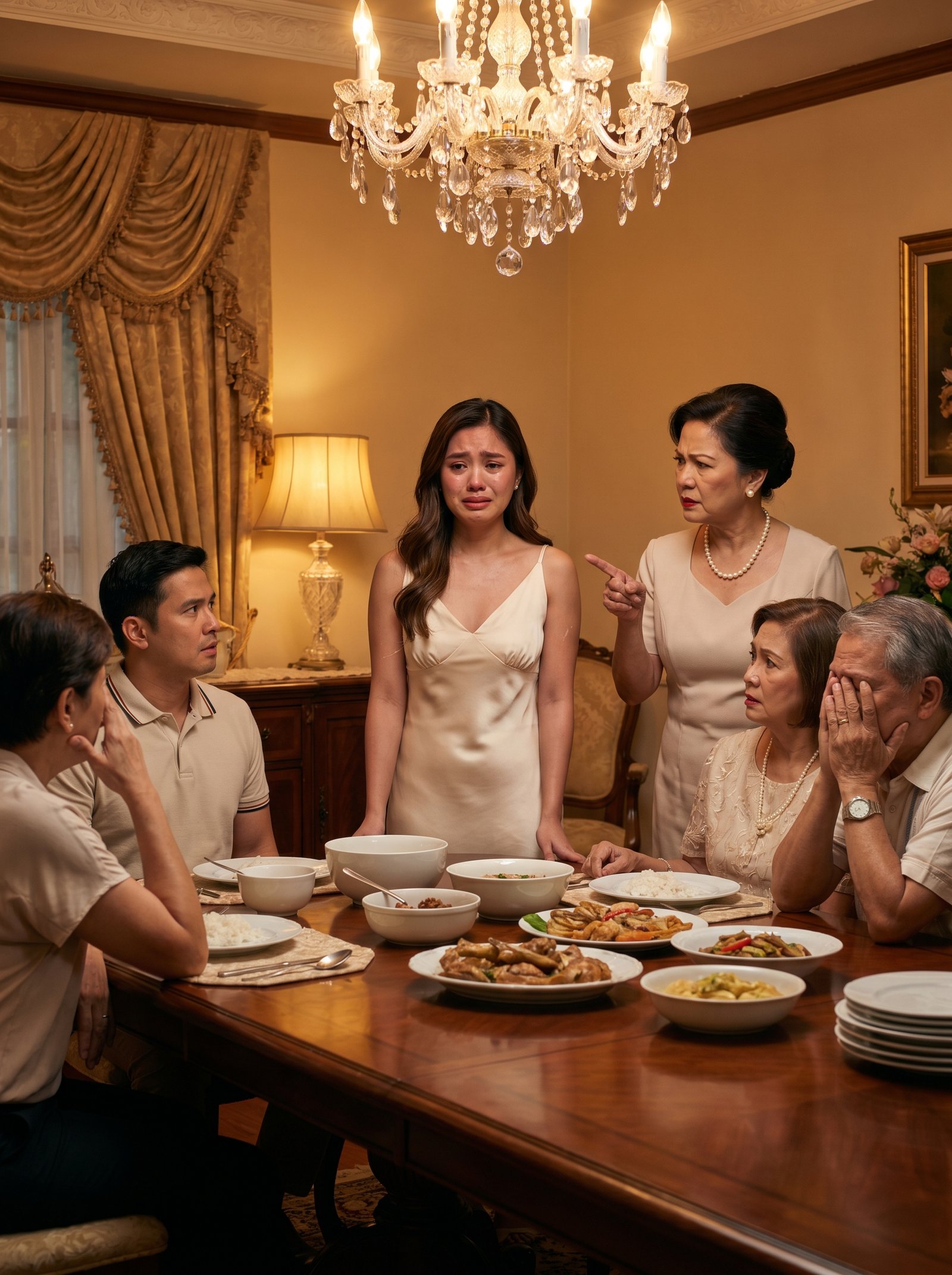 Sa ilalim ng malaking kristal na chandelier, lalo siyang naging maliit sa paningin ng lahat. Ang ilaw na tumatama sa mamahaling kurtina, sa makintab na kahoy ng mahabang hapag, sa mga mangkok ng pagkain at platong maayos ang pagkakasalansan, ay parang hindi init ang dala. Kundi paghuhusga.