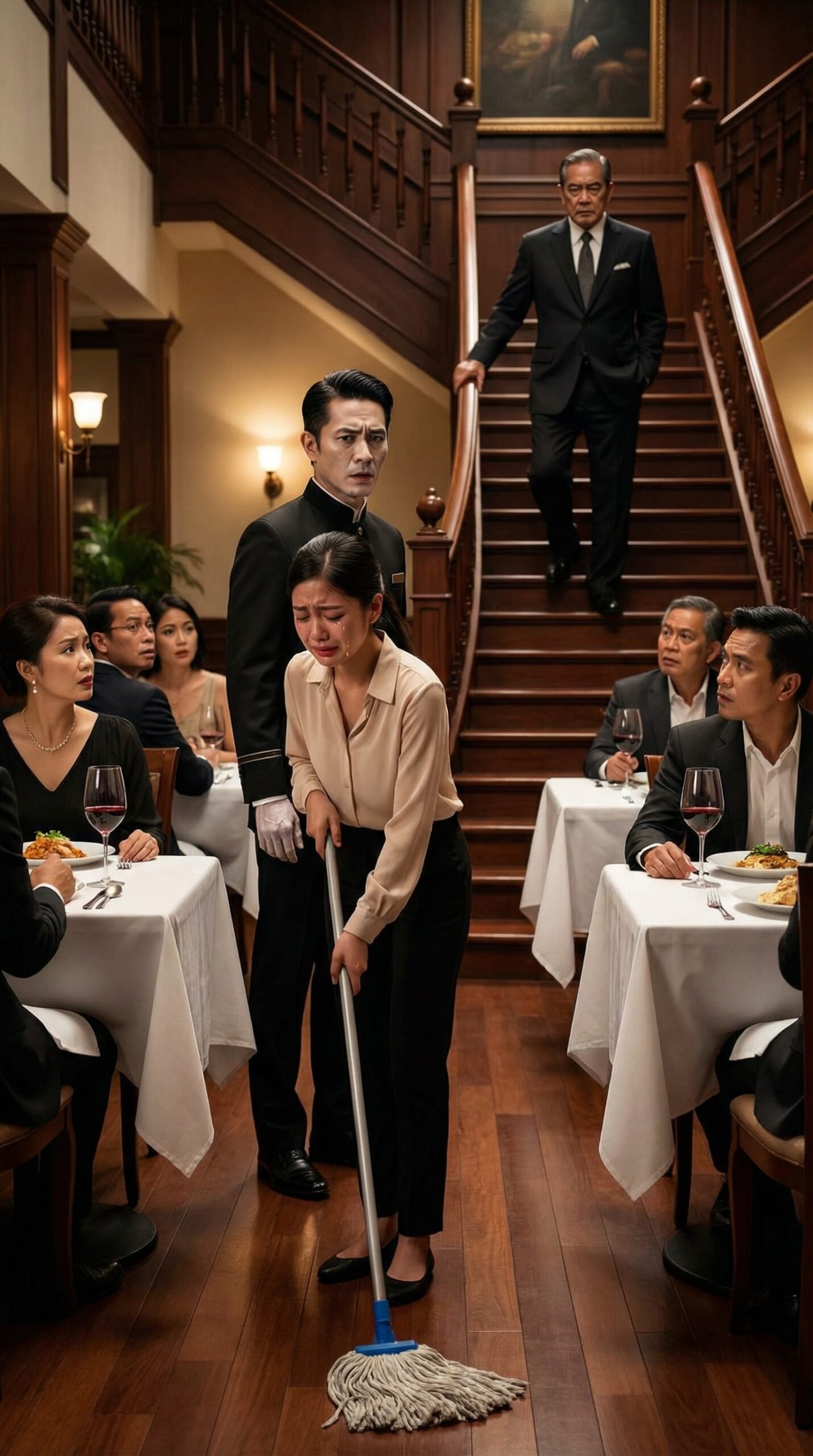 Isang bagong hire na halos hindi pa nakakabawi sa kaba ang pinilit magmop ng sahig sa gitna ng mamahaling restoran habang nakatingin ang mga bisitang nagbubulungan at lihim na humuhusga, at sa bawat dampi ng basang mop ay lalo siyang nilulubog sa kahihiyan ng isang kapwa empleyadong sanay mang-api at magpasikat sa harap ng lahat, ngunit walang sinuman ang naghanda sa sandaling bumukas ang pinto mula sa pribadong silid sa itaas—dahil sa pagbaba ng isang taong hindi nila inaasahan, ang buong eksena ay biglang nagbago at ang dating puno ng yabang ay siya mismong napilitang manlumo sa sarili niyang ginawa.