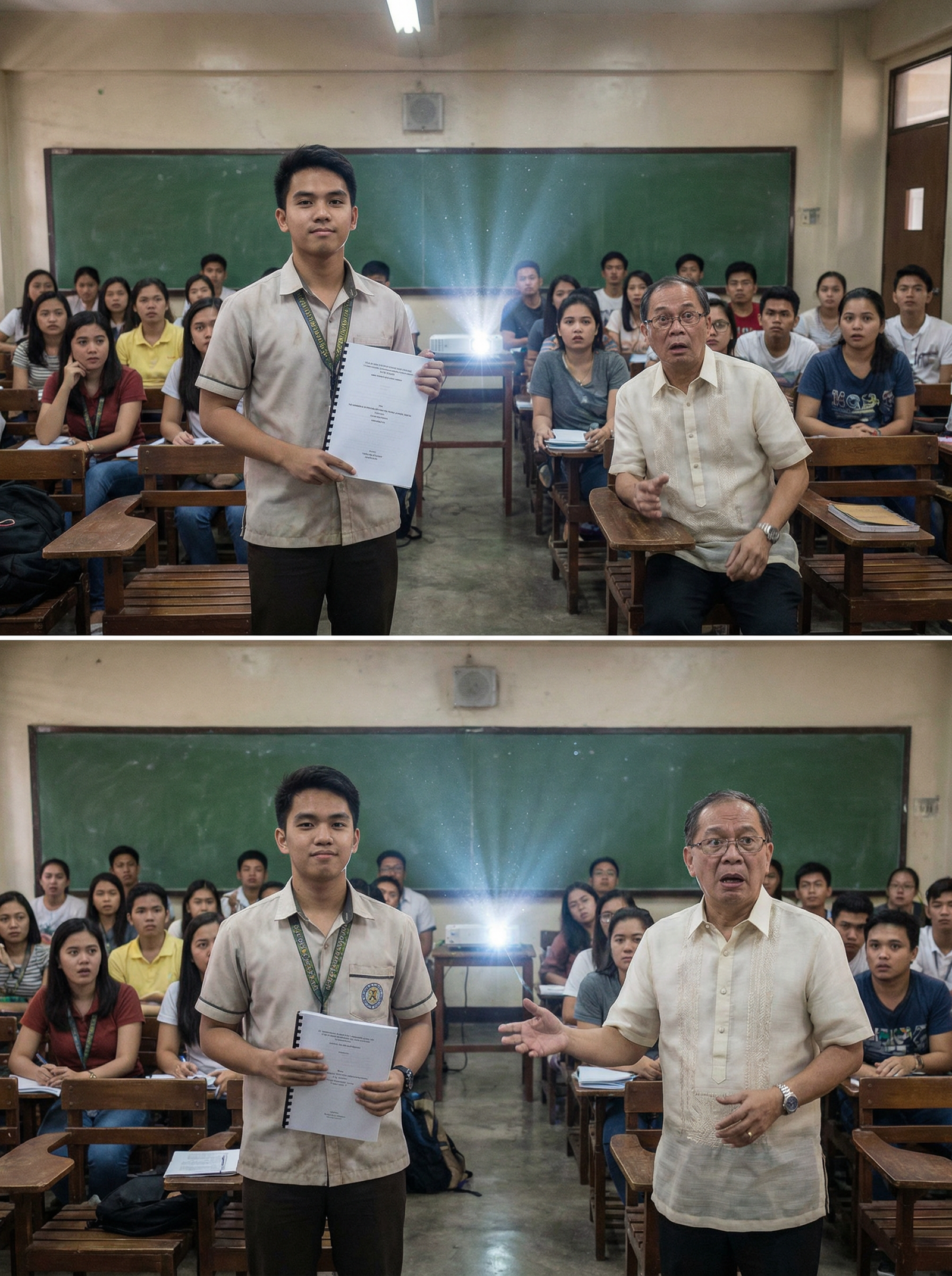 Matagal na walang nagsalita sa loob ng silid. Ang tanging maririnig ay ang mahinang ugong ng electric fan at ang pagaspas ng mga pahina habang hawak pa rin ni Professor Valdez ang research paper ni Elias. Ang guro na kanina lang ay napakalakas ng boses sa panenermon ay ngayo’y tila hindi mahanap ang tamang salita.