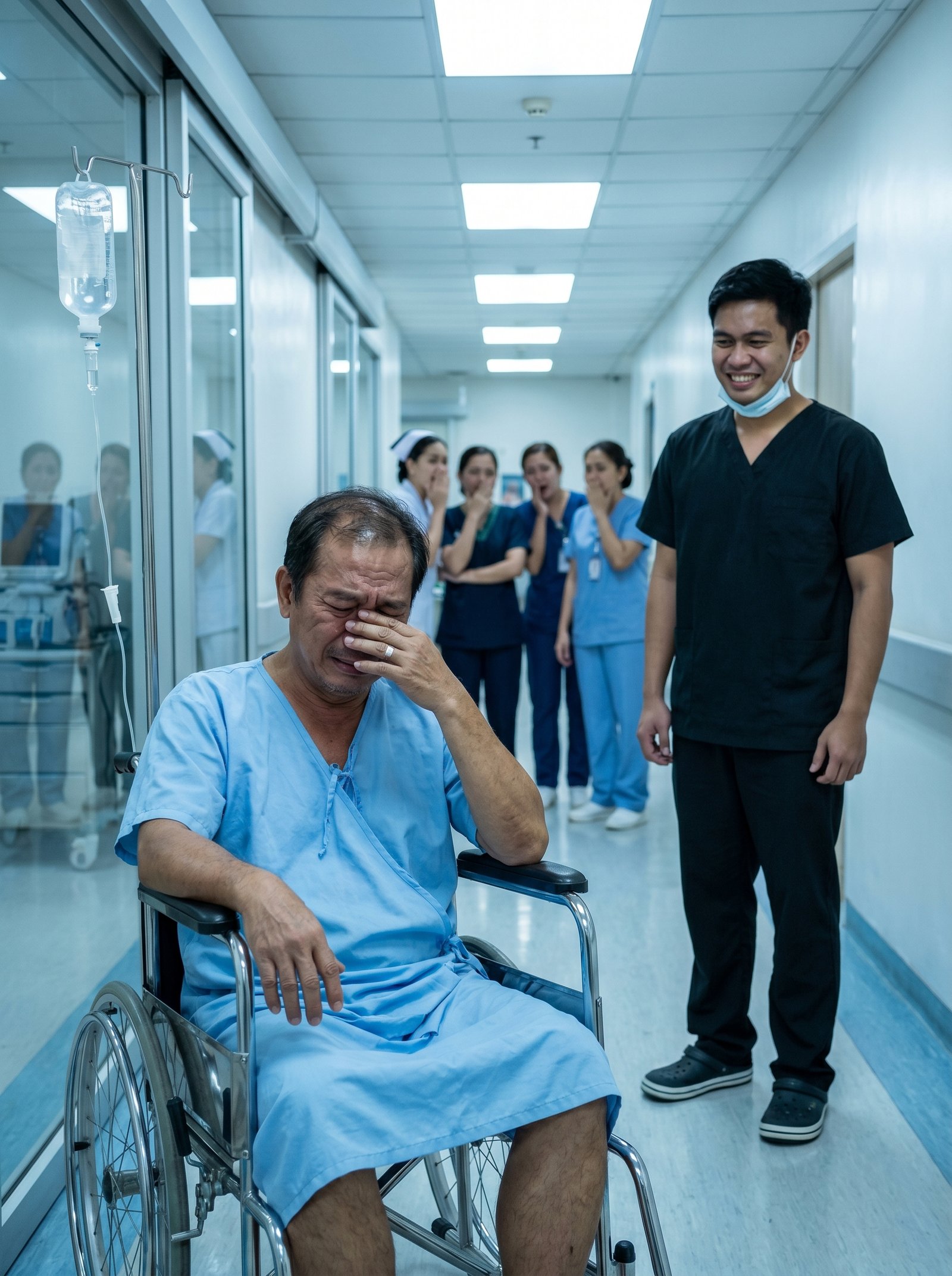 Walang naghanda sa mahabang pasilyo ng ospital para sa eksenang iyon. Sa ilalim ng malamig na puting ilaw, katabi ng nakasabit na suwero at sa tabi ng salaming pinto ng ward, nakaupo sa wheelchair ang isang lalaking naka-asul na hospital gown. Nakayuko siya. Nakakapit ang isang kamay sa armrest. Ang isa, nakatakip sa mukha niya habang pilit niyang pinapahid ang luha na ayaw tumigil. Namumula ang ilong niya. Nanginginig ang balikat niya. At sa harap niya, nakatayo ang isang lalaking naka-itim na scrubs, nakangisi pa na parang ang pag-iyak ng pasyente ay isa lamang abalang puwedeng pagtawanan.