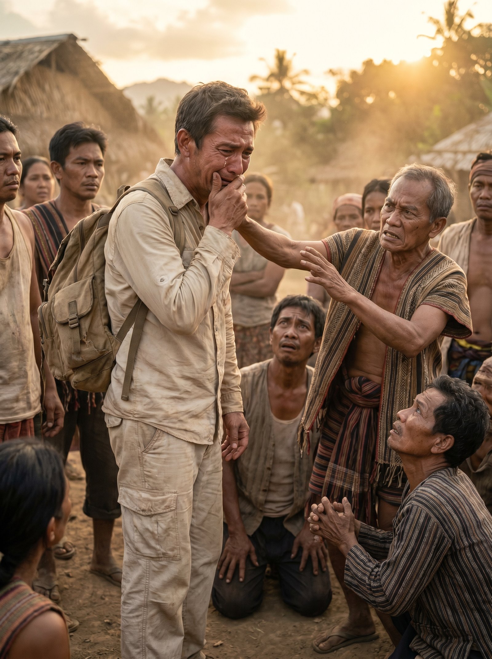 May isang matandang lalaking lumapit at hinawakan ang balikat niya, parang hindi na kayang panoorin ang sakit sa mukha nito. May isang lalaking nakaluhod sa lupa, nakatingala, halos magmakaawa ang tingin. Ang iba, nakapaligid lang. Tahimik. Takot. Naghihintay.