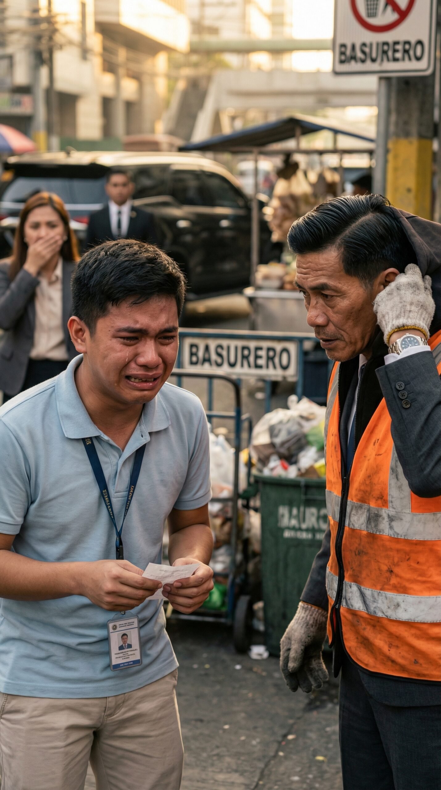 Sa gitna ng abalang kalsada—habang sumisigaw ang mga busina, umiinit ang aspalto, at kumakapit sa hangin ang amoy ng basura—may isang eksenang hindi mo basta malalampasan. Isang batang empleyado na umiiyak, nanginginig ang hawak sa maliit na papel. Isang lalaking naka-orange na safety vest, may guwantes, at may relo sa pulso na hindi bagay sa basurero—nakatingin nang mabigat, parang may nilulunok na lihim. Sa likod nila, nakatayo ang karatulang “BASURERO,” at sa tabi nito, isa pang tanda na parang banta: bawal magtapon. Ang tanong: sa araw na ito, sino ang totoong marumi—ang kalsada, o ang sistema?