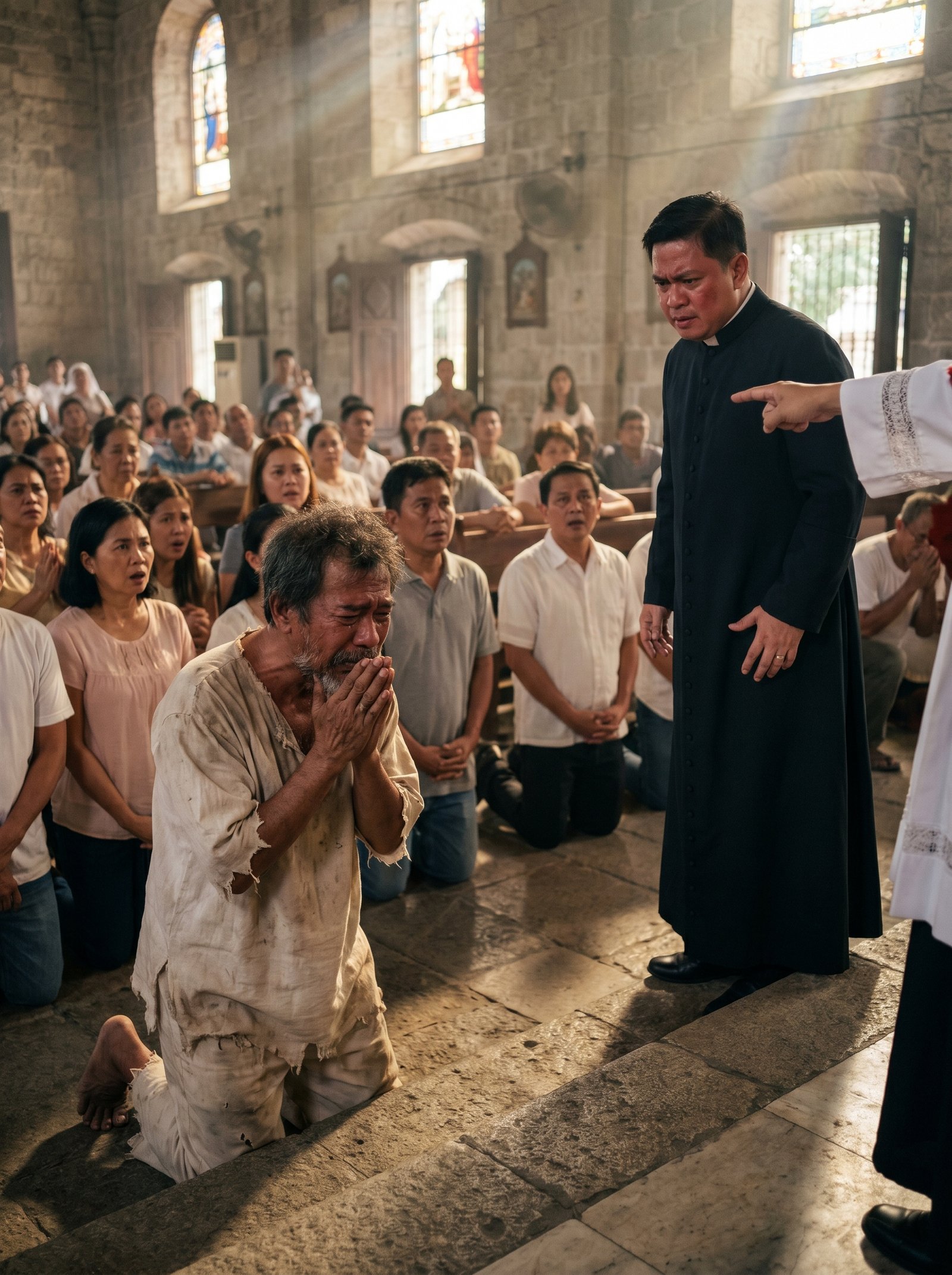 Walang naghanda sa lumang simbahang bato para sa eksenang iyon. Sa ilalim ng sinag ng araw na pumapasok sa matataas na bintanang may kulay, sa gitna ng malamig na sahig at mga matang sabay-sabay na nakatutok sa harapan, may isang maruming lalaking nakaluhod sa tapat ng altar. Gusot ang damit niya. Pudpod ang laylayan. Nanginginig ang mga kamay habang magkadaop sa tapat ng bibig na para bang pinipigil niya ang isang hikbi na matagal nang ayaw tumigil. Sa paligid niya, ang mga tao sa pews ay hindi na makahinga nang maayos. Ang iba, napahawak sa dibdib. Ang iba, napaluhod na rin sa gulat. Ang ilan, nakatitig lang, na para bang hindi nila alam kung awa ba o takot ang una nilang mararamdaman.