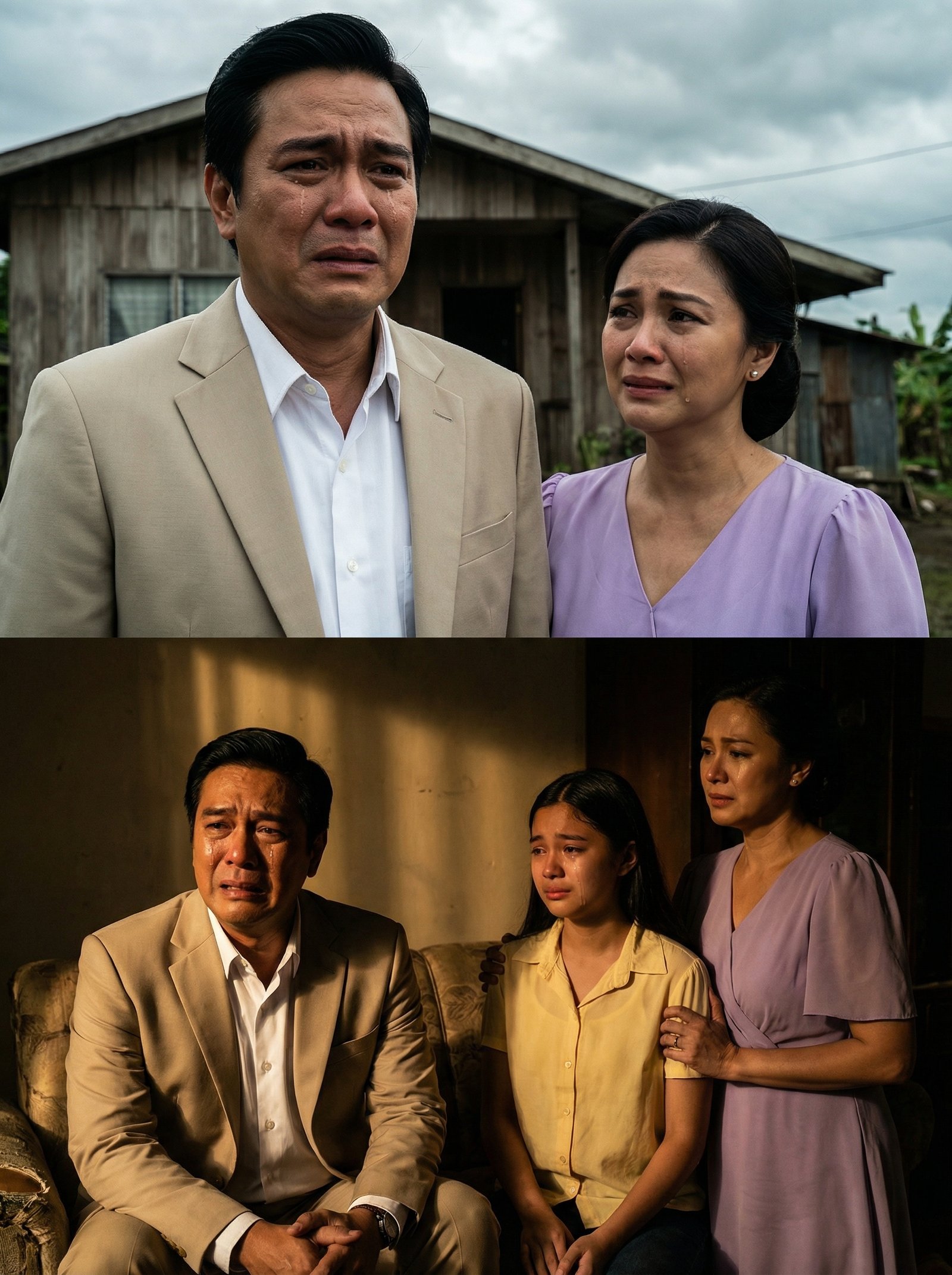 Sa unang larawan, makikita ang isang lalaking nakasuot ng mamahaling beige na suit. Sa kanyang tabi ay isang babaeng naka-lavender na damit, ang kanyang kasalukuyang asawa—isang sosyal at elegante. Pareho silang luhaan habang nakatayo sa harap ng isang lumang kahoy na bahay na tila ilang dekada nang hindi napapaganda.