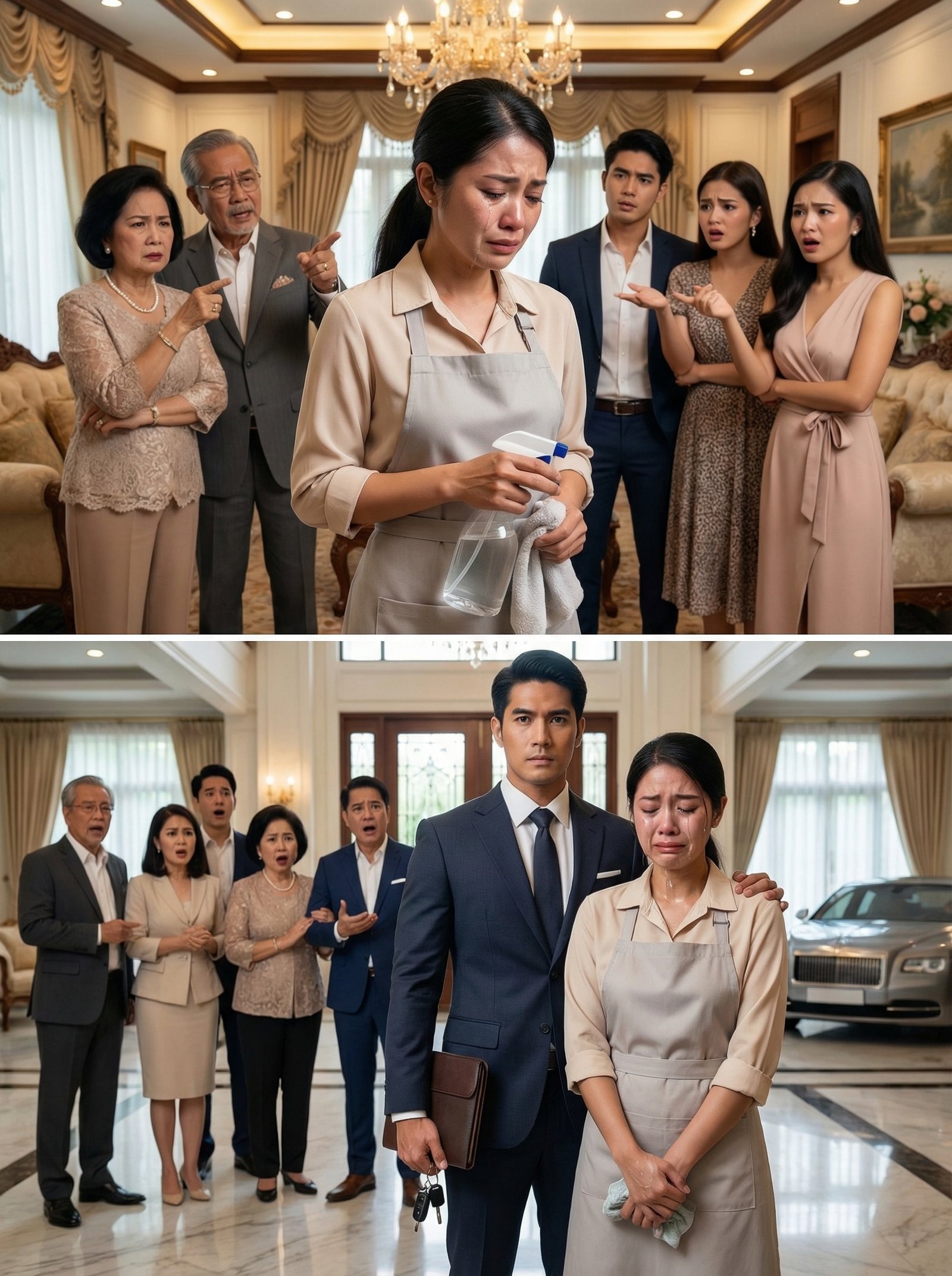 Sa gitna ng marangyang sala, nakatayo si Lina habang hawak pa ang bote ng panlinis at tuyong basahan. Hindi siya agad nagsalita. Sa harap niya, nakaupo si Doña Celina na parang hukom. Nakatayo sa magkabilang gilid nito sina Veronica at Camille, parehong may mga matang puno ng paghamak. Sa likod nila, ang nakatatandang lalaking si Don Ernesto ay tahimik lang noong una, ngunit halata ring kampi na sa sariling pamilya. Para sa mga tulad nila, hindi na kailangan ng katotohanan kung may isang mahirap na taong puwede nang gawing dahilan ng kanilang galit.