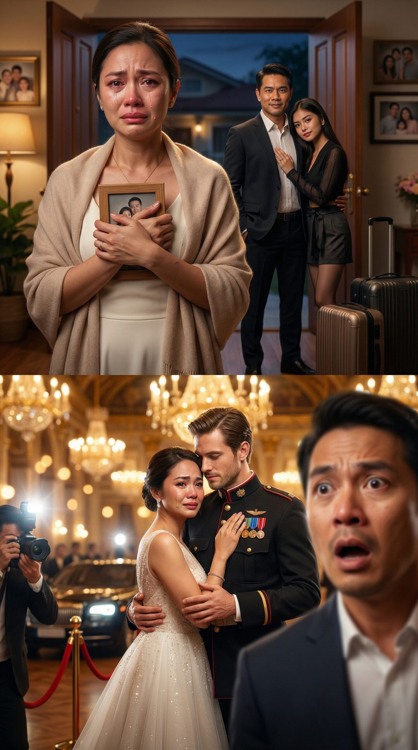 Sa sala na may malambot na ilaw ng lampshade at mga litrato sa dingding, nakatayo si Elisa sa harap ng bukas na pintuan. Yakap niya ang isang framed photo, mahigpit, halos durog na ang kahoy sa kapit niya. Namumula ang mata niya, basang-basa ang pisngi, at nanginginig ang labi na pilit kumakapit sa dignidad kahit wasak na wasak na ang puso. Sa likod niya, dalawang maleta ang nakahanda—mga bagaheng hindi lang damit ang laman, kundi mga taon ng pagsasama na biglang ginawang “pwedeng iwan.”