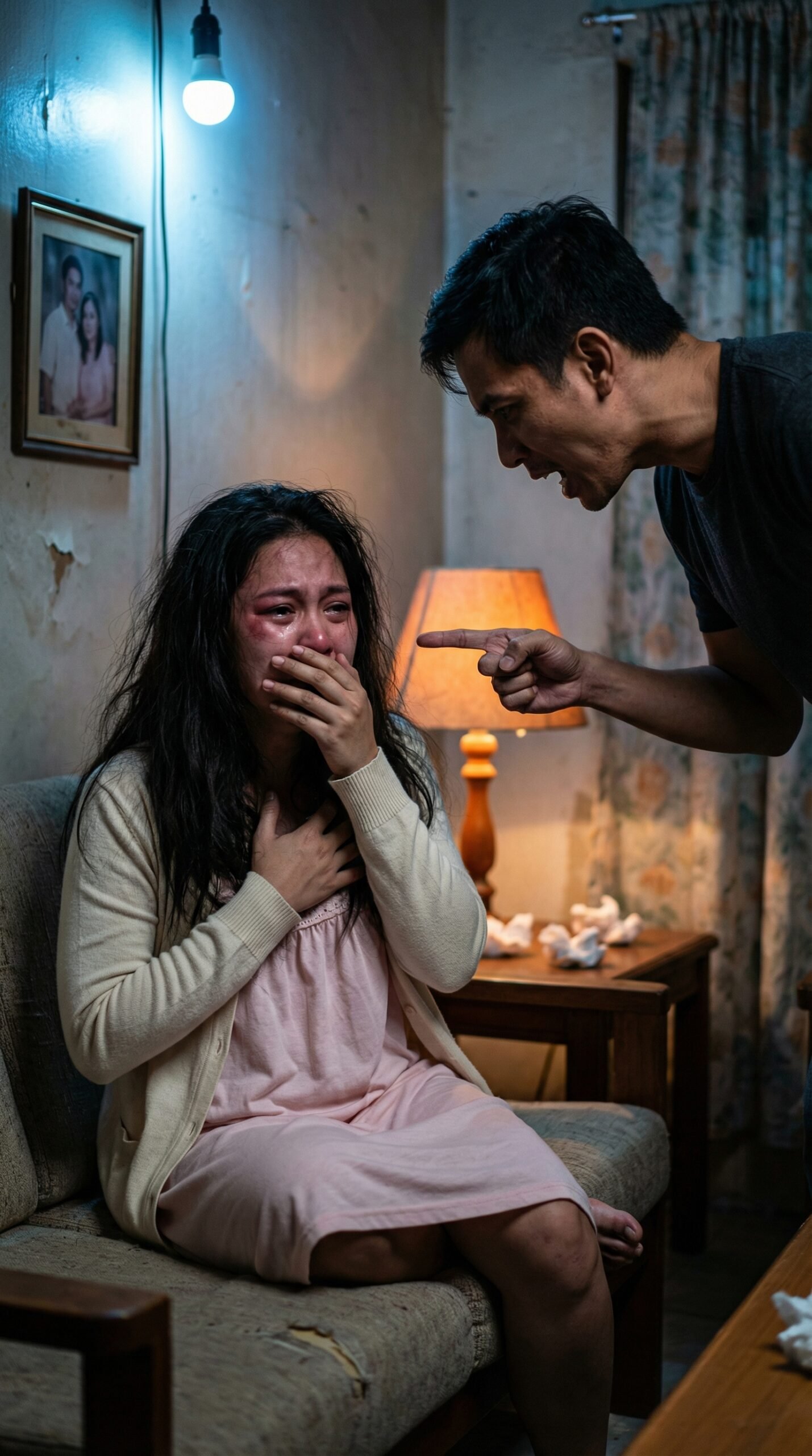 Si Mara ang nakaupo sa sofa. Gusot ang buhok, namumugto ang mata, at ang isang kamay niya ay nakatakip sa bibig na parang pinipigilan niyang sumabog ang iyak sa buong bahay. Ang kabila, nakahawak sa dibdib, hindi dahil masakit ang puso sa romantikong paraan—kundi dahil parang may nakadagan na bato sa bawat paghinga. Sa harap niya, nakayuko at nakatungo ang isang lalaki—si Anton—nakabaluktot ang leeg sa galit, nakaturo ang daliri, at ang bibig niya ay baril na walang tigil pumutok.