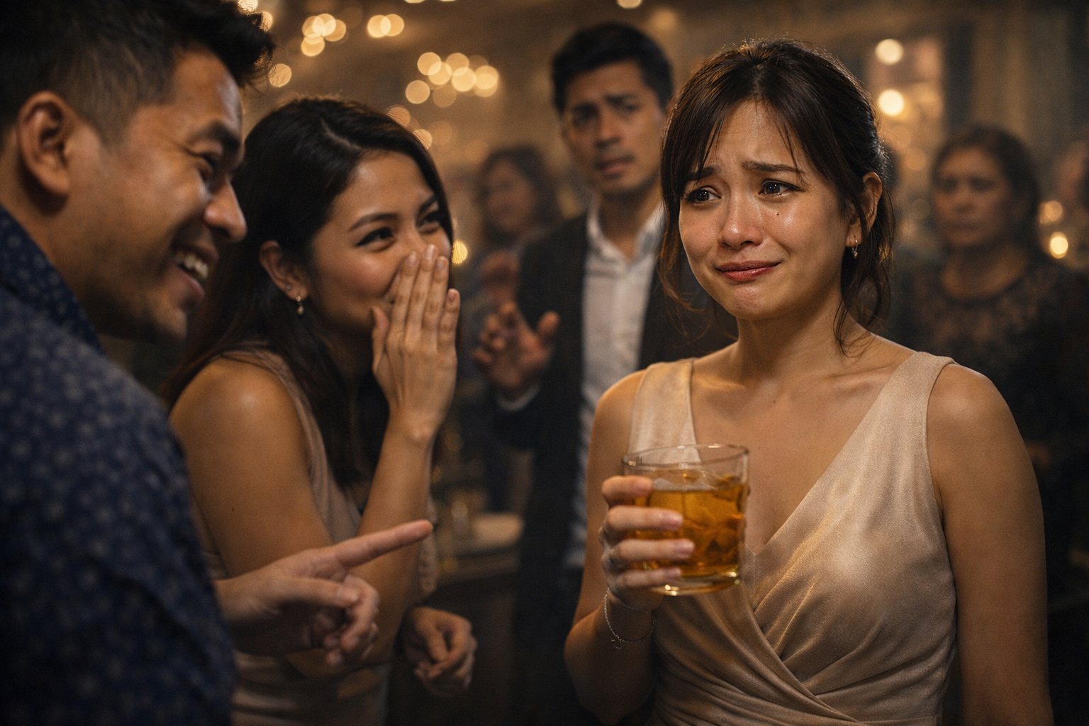 May mga gabi sa party na hindi mo malalaman kung alin ang mas nakakalasing—‘yung alak sa baso, o ‘yung mga salitang hindi mo naman iniinom pero pilit ipinapainom sa’yo ng mga tao. Sa ilalim ng warm na ilaw at kumikislap na bokeh sa likod, nakatayo si Camille sa gitna ng ingay, suot ang beige na dress na maayos sana kung hindi lang nanginginig ang dibdib niya. Hawak niya ang baso ng amber na inumin, pero hindi niya halos malasahan. Ang mas ramdam niya ay ang bigat ng luha na pilit niyang kinokontrol habang nakatitig sa mga mukhang tumatawa—mga mukhang hindi man lang nag-abala na itago ang pang-ookray.