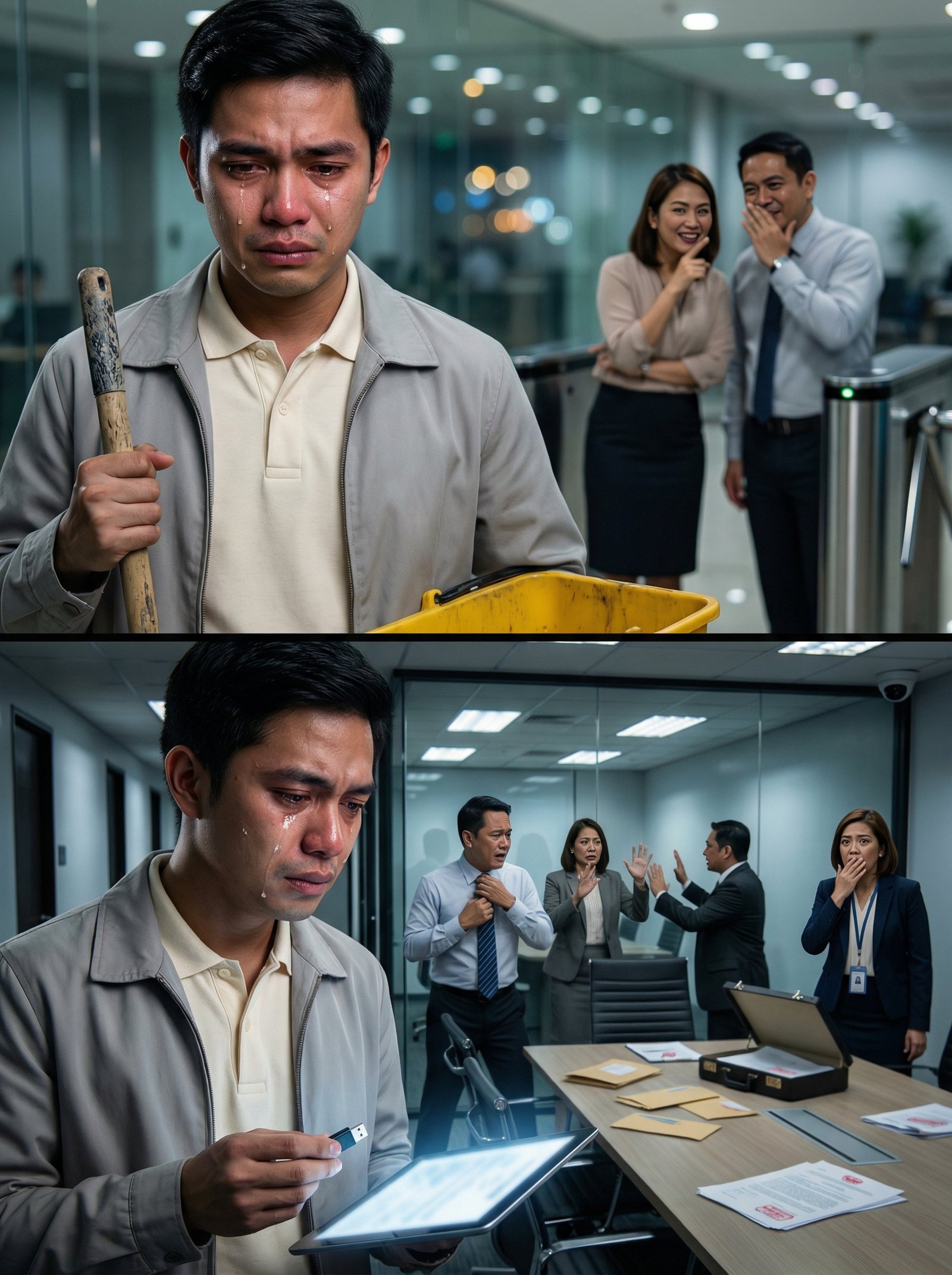 May mga pagkakataon na ang isang luha ay mas mabigat pa sa isang bucket ng maruming tubig. Sa loob ng isang modernong opisina na punô ng salamin at malamig na ilaw, may isang lalaking nakatayo sa harap ng turnstile—hawak ang mop handle sa isang kamay at dilaw na timba sa kabila. Tahimik siyang umiiyak, hindi dahil napagod siya sa paglinis, kundi dahil sa paraan ng pagtawa ng mga taong naka-formal sa likod niya—yung tawang nakatakip ang bibig, yung bulungan na parang kutsilyo, yung tingin na nagsasabing, “Hanggang diyan ka lang.” Ang tanong: paano kung ang janitor na minamaliit nila… ang tanging taong kayang magbukas ng katotohanang pinagtatakpan ng buong kumpanya?