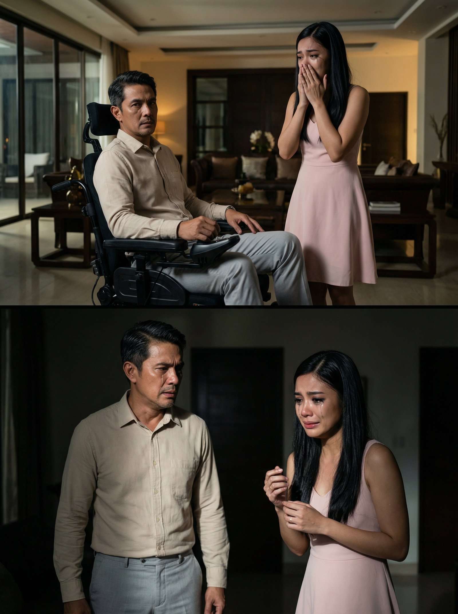 Sa loob ng isang marangyang sala na may malalaking salamin at mamahaling kasangkapan, makikita ang isang lalaki na nakaupo sa isang modernong wheelchair. Suot niya ang simpleng beige na polo at kulay abong pantalon. Ang kanyang mukha ay seryoso, halos walang emosyon. Sa tabi niya, nakatayo ang isang dalagang nakasuot ng mapusyaw na rosas na damit. Ang kanyang mga kamay ay nakatakip sa bibig, ang mga mata ay namumugto sa pag-iyak.