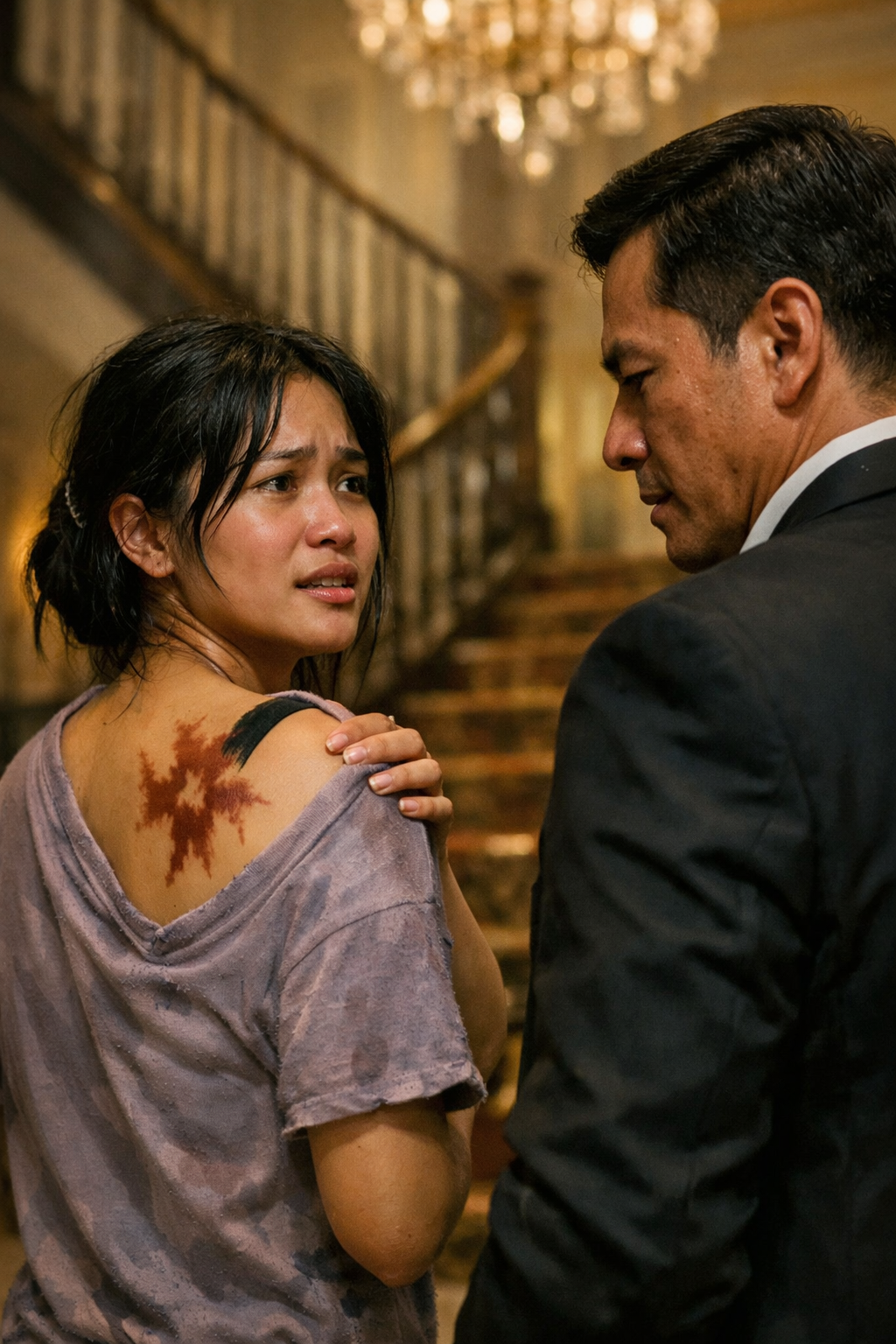 Hindi sana mapapansin si Lina kung hindi siya biglang nadapa sa sobrang panghihina. Napasubsob siya sa marmol na sahig sa bungad ng pinto. Kumalat ang ilang lumang dokumento mula sa bag niya, pati isang pirasong tela na nakabalot sa maliit niyang baon. Yumuko agad si Sofia para tulungan siya. “Miss, ayos ka lang ba?” tanong nito. Hindi agad nakasagot si Lina. Dahan-dahan siyang tumayo, at sa pag-angat ng kamay niya para ayusin ang nahulog na damit sa balikat, bahagyang lumitaw ang isang birthmark—hugis gasuklay, kulay mapusyaw na kayumanggi, eksaktong nasa ilalim ng kaliwang balikat niya. Isang segundo. Dalawang segundo. Tapos biglang tumahimik ang buong paligid.