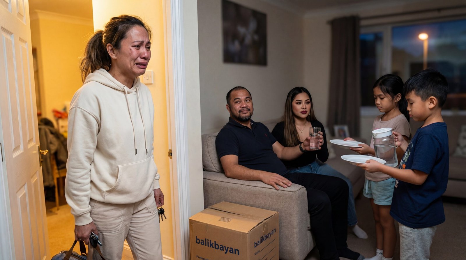 Sa loob ng sala, may ilaw na mainit at malambot, may sofa na pamilyar, at may kahon ng balikbayan sa gilid—parang nakangising saksi sa lahat ng taon niyang pagpupuyat. Sa mismong upuan, nakasandal ang asawa niyang si Rodel, kampanteng kampante, hawak ang baso na may tubig na parang wala lang. Sa tabi niya, may babaeng nakaayos ang buhok, makapal ang lipstick, at ang tingin ay hindi na bago sa bahay na ‘to—parang siya ang may-ari ng espasyo. At sa harap nila, dalawang bata ang nakatayo: ang anak niyang lalaki may hawak na pitsel, ang anak niyang babae may dalang plato—pinagsisilbihan ang “bisita” na hindi dapat nandito.