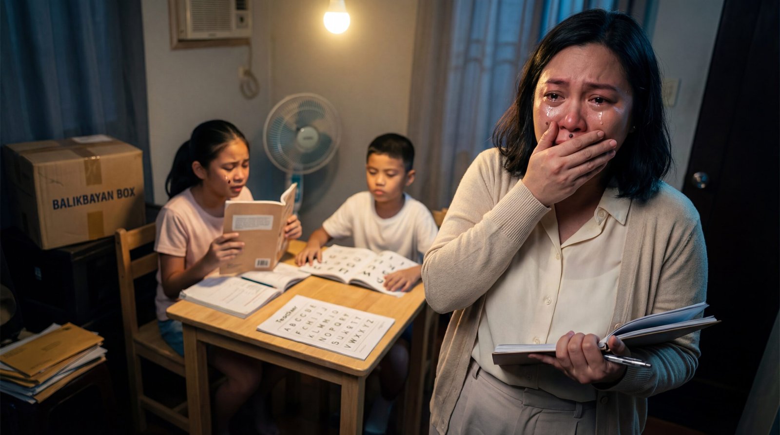 Sa likod niya, may dalawang batang nakaupo sa mesa. Yung panganay, nakayuko, pilit binabasa ang libro pero paulit-ulit natitigilan, parang nalulunod sa mga letra. Yung bunso, nakatitig sa worksheet na may malalaking alpabeto, pero hindi makasunod—parang hindi pamilyar ang A, B, C sa kanya kahit dapat matagal na niyang kabisado. Sa gilid, may kahon na may nakasulat: “Balikbayan Box.” Parang paalala na may taong malayo na nagtatrabaho para dito.