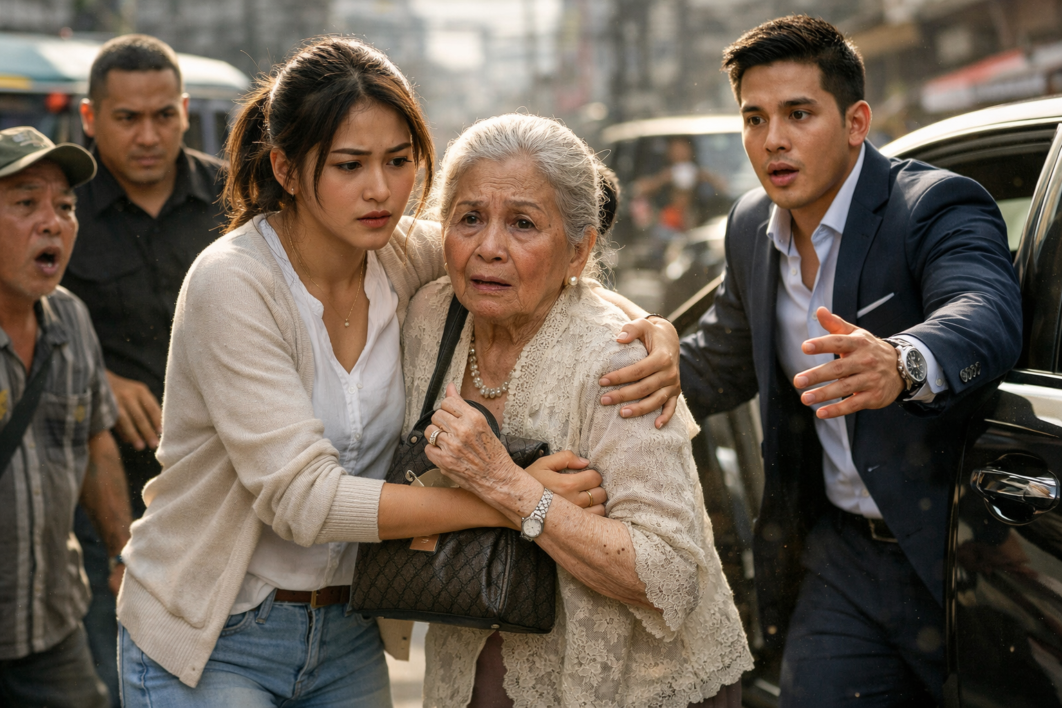 Nangyari ang lahat sa loob ng ilang segundo. May sumingit na motorsiklo, may bumusina nang malakas, at may matandang babae na muntik nang matumba sa gitna ng siksikan. Ang mata ng lola, nanlaki, parang biglang nawala ang direksyon ng mundo. Ang tuhod niya nanghina, at bago pa siya tuluyang bumagsak, si Mira ang sumalo.