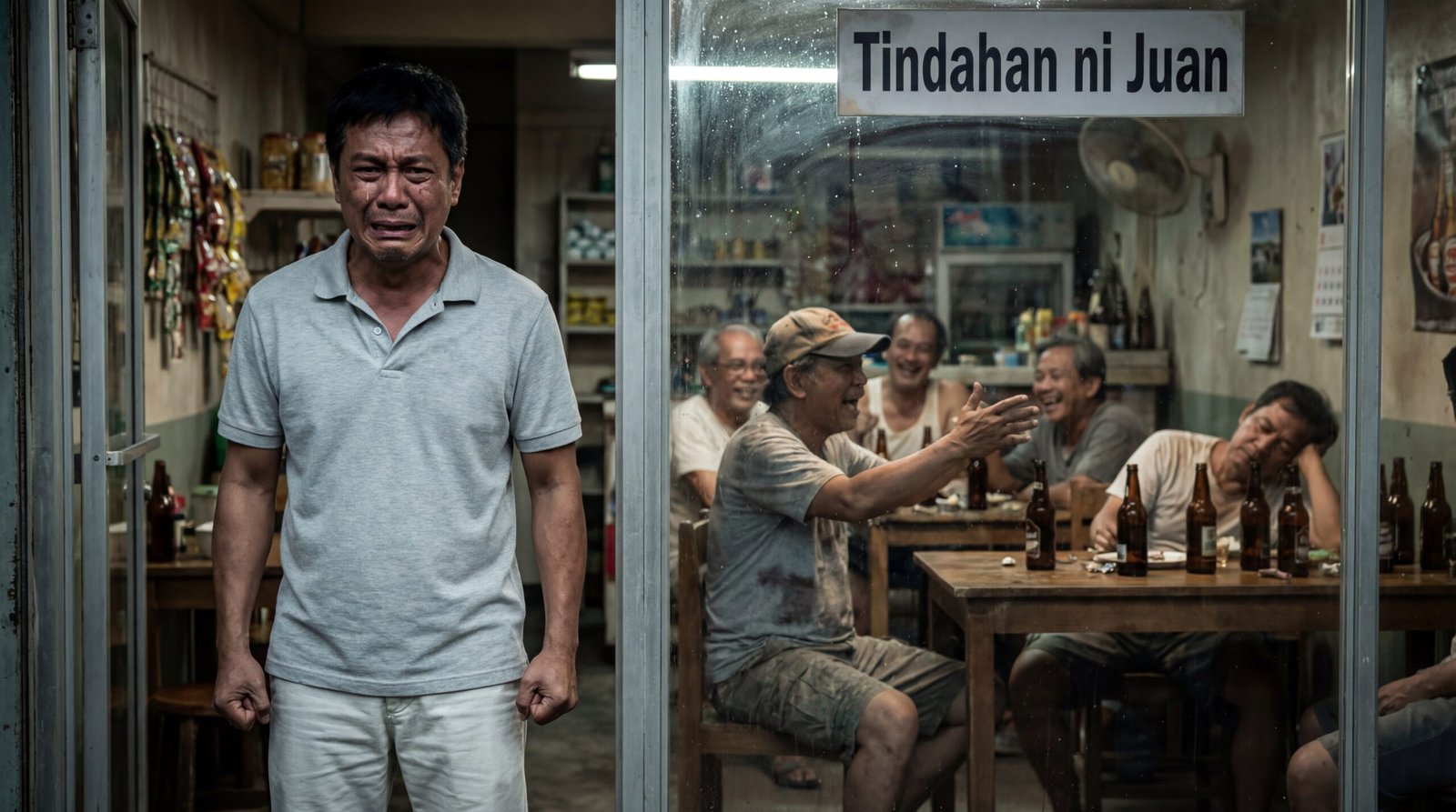 Hindi siya umiyak sa eroplano. Hindi rin siya umiyak sa immigration, kahit ilang beses siyang hinarang noon sa abroad at pinilit ngumiti para lang hindi mabasa ang pagod niya. Pero nang makita niya ang karatulang “Tindahan ni Juan” na nakasabit pa rin sa maruming salamin—habang sa loob, may mga lalaking nagtatawanan, nagkakantiyawan, may mga boteng nakahilera sa mesa, at isa pang nakasandal sa upuan na parang wala nang bukas—doon niya naramdaman na may mas malupit pa pala kaysa homesickness: yung niyurakan ang paghihirap mo habang ibang tao ang nagsasaya sa pinaghirapan mo. Sa labas ng pinto, nakatayo siya, nanginginig ang panga, nakapulupot ang kamao, luha na mainit sa pisngi, habang unti-unting nauupos ang lahat ng pangarap na binitbit niya pauwi.