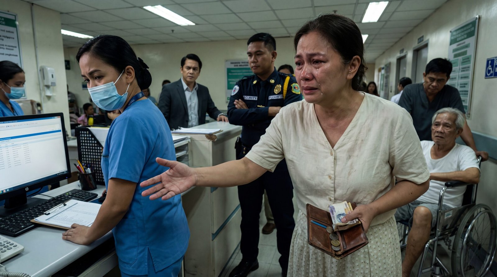 Hindi siya napaiyak dahil sa sakit ng katawan. Napaiyak siya dahil sa tunog ng barya sa palad niya—yung tunog na parang nagsasabing, “Ito lang ang kaya ko,” habang ang fluorescent lights sa hallway ng ospital ay kumikislap-kislap at ang amoy ng alcohol, bleach, at pagod ay kumakapit sa lalamunan. Sa harap ng isang computer sa registration counter, nakatayo ang isang nurse na naka-asul na scrubs at naka-mask, nakatuon ang mata sa screen na parang doon lang umiikot ang mundo. Pero sa tabi niya, may isang nanay na halos maputol ang hininga sa kakapigil ng iyak, nakaunat ang kamay, nakabukas ang lumang pitaka—may lukot na papel na pera at ilang barya na parang huling depensa ng isang pamilyang nauubos.