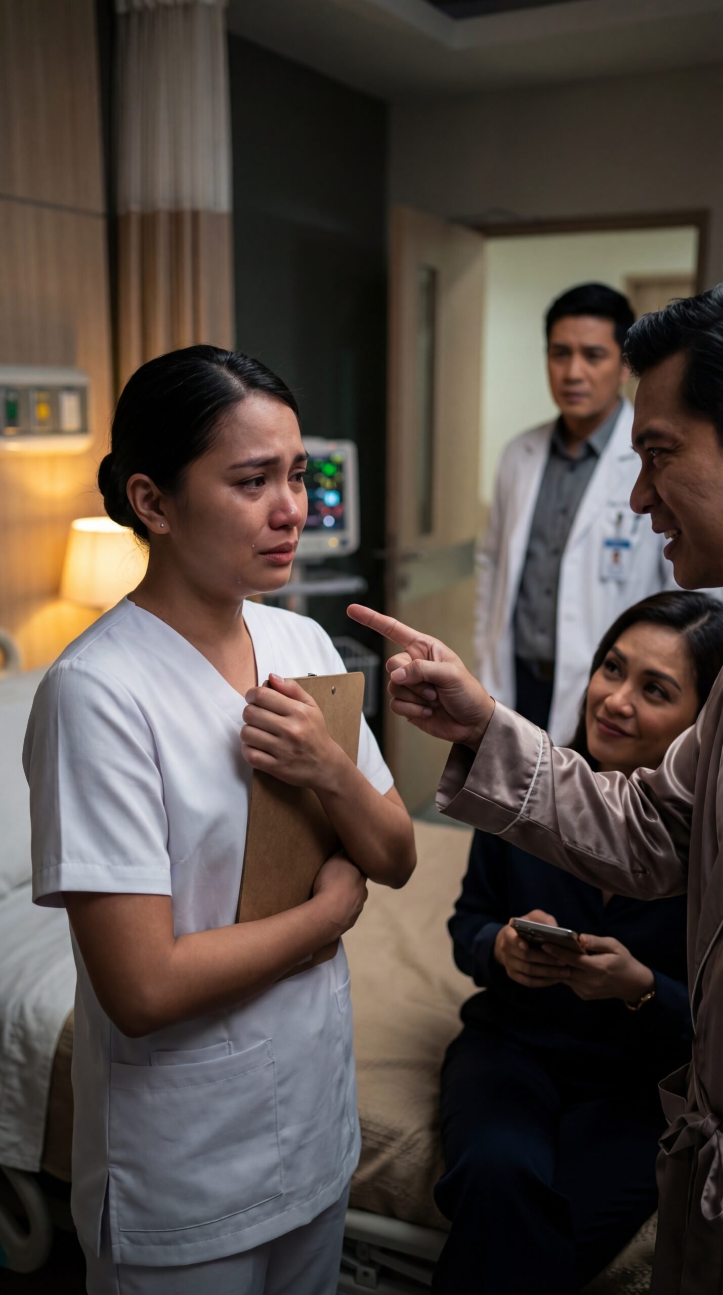 Sa loob ng isang private hospital room na malamig ang ilaw at mabigat ang hangin, may isang eksenang sa unang tingin ay simpleng pangmamaliit lang—pero sa totoo, iyon ang mismong sandaling babaliktad sa kapalaran ng mga taong sanay mang-apak. Sa tabi ng kama, kumikislap ang monitor na may mga berdeng linya, tahimik na nagbibilang ng tibok na parang orasan ng katotohanan. Sa harap nito, isang nurse na naka-puting scrubs ang nakatayo, yakap ang clipboard sa dibdib na parang kalasag, habang pinipigilan ang luha na tumatakas sa pisngi niya. Sa tapat niya, isang lalaking nakarobe ang nakasandal at nakaturo ang daliri sa mismong mukha niya—malapit, mapang-insulto, at punong-puno ng yabang. Sa gilid ng kama, isang babaeng mukhang may kaya ang nakaupo, may hawak na cellphone at may ngiting parang nanonood lang ng palabas. At sa likod, sa may pintuan, isang doktor na naka-white coat ang nakatayo—nakakunot ang noo, halatang may naririnig na hindi niya gusto, pero parang naghahanap pa ng tamang sandali para sumingit.