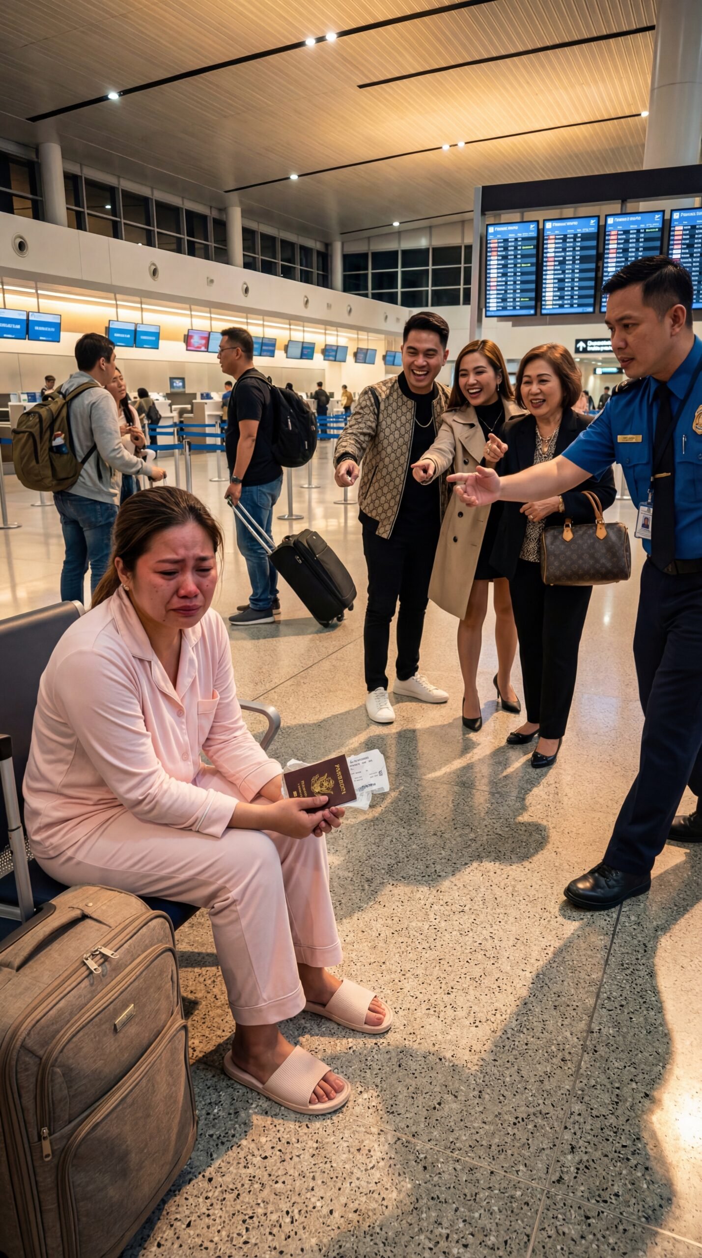 May mga gabing ang airport ay parang lungsod na hindi natutulog—puting ilaw sa kisame, malalamig na sahig na kumikislap sa linis, at mga boses na naglalakbay sa hangin kasabay ng tunog ng gulong ng maleta. Pero sa gitna ng lahat ng iyon, may isang babaeng nakaupo sa upuan sa waiting area, naka-pajama lang, hawak ang pasaporte at tiket na halos mabasa sa panginginig ng kamay. Ang mata niya, namumula. Ang pisngi niya, basang-basa. At sa bawat luha niyang tumutulo, parang may lihim na pilit niyang kinakain para hindi sumabog sa harap ng mga taong walang pakialam.