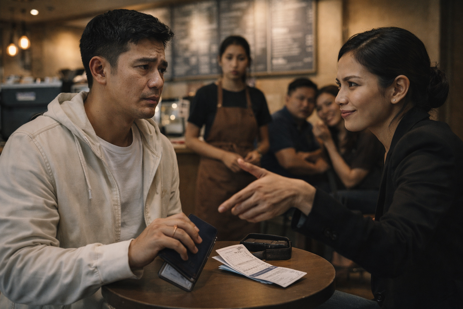 Sa loob ng coffee shop, mainit ang ilaw at mabango ang hangin—amoy espresso, toasted bread, at mga pangakong hindi natupad. Sa likod, may chalkboard menu na puno ng pangalan ng kape na hindi mo na binabasa kapag bigat ang laman ng dibdib mo. May barista na nakatayo sa may counter, nakamasid pero walang magawa, at may dalawang magkaibigan sa sulok na nagbubulungan habang pasulyap-sulyap sa mesa sa unahan. Sa gitna ng maliit na bilog na mesa, may resibo, may phone, at may wallet na nakabukas—parang simbolo ng isang taong pilit pinapatunayan na kaya pa rin niyang tumayo.