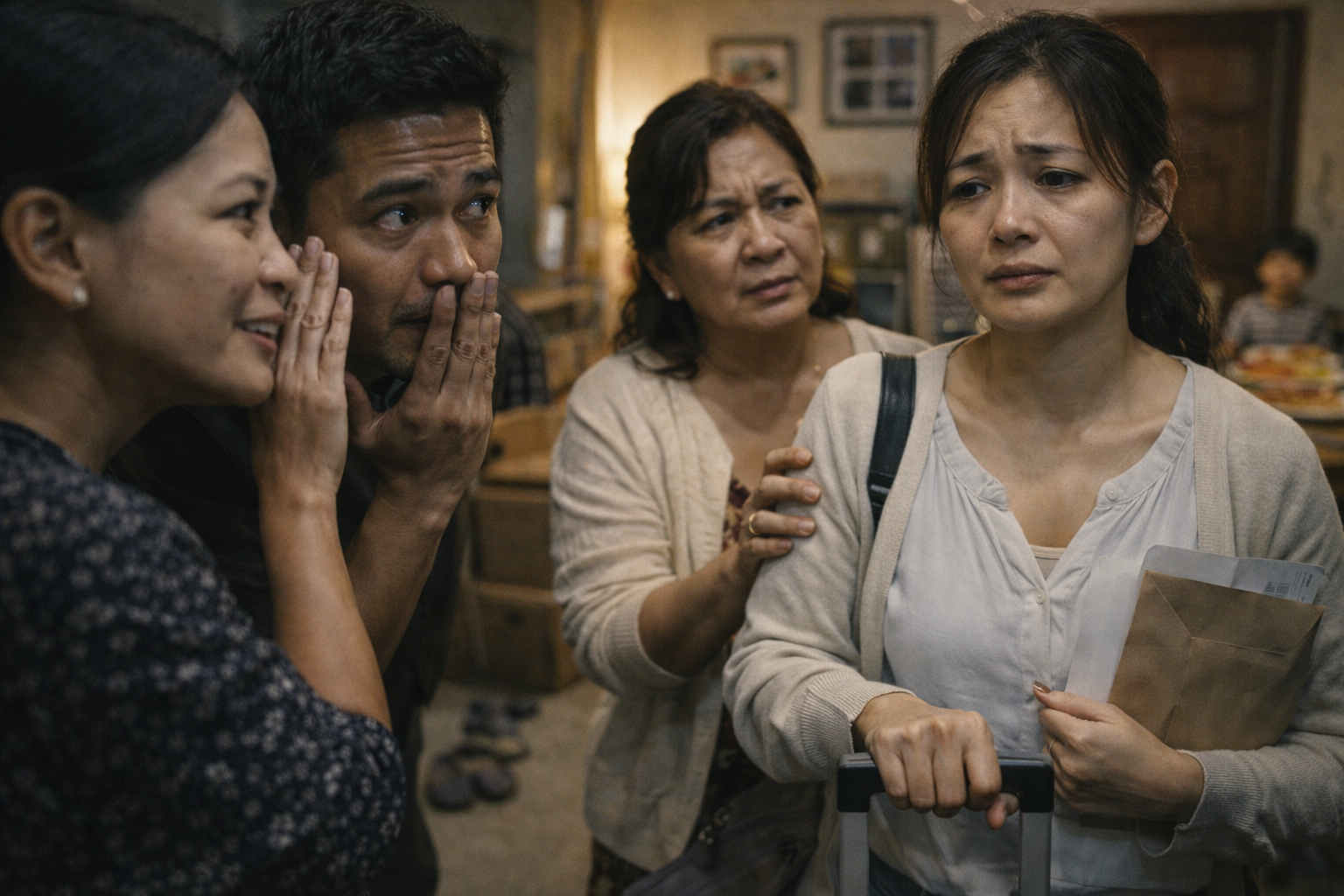 Si Mia, halos hindi makatingin kahit kanino. Namumula ang mata niya, nanginginig ang labi na pilit pinipigilan ang luha. Hindi siya umiyak sa airport. Hindi siya umiyak sa biyahe. Hindi siya umiyak sa huling araw sa factory. Pero dito, sa sarili niyang sala, sa harap ng pamilyang dapat unang umunawa, doon siya halos bumigay.