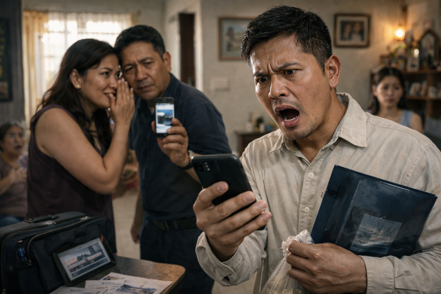 Sa likod niya, may dalawang tao na nagbubulungan: isang babae na malapit ang bibig sa tainga ng lalaki, at yung lalaki, hawak ang sariling cellphone na may larawan sa screen, parang ebidensya. Sa gilid, may matandang babae na nakaupo, nakabuka ang bibig na tila nagugulat din, at sa dulo ng sala, may isang babae—posibleng asawa—nakatingin, tahimik, nanginginig ang mata, parang hindi alam kung maniniwala ba sa tsismis o sa taong kaharap niya.