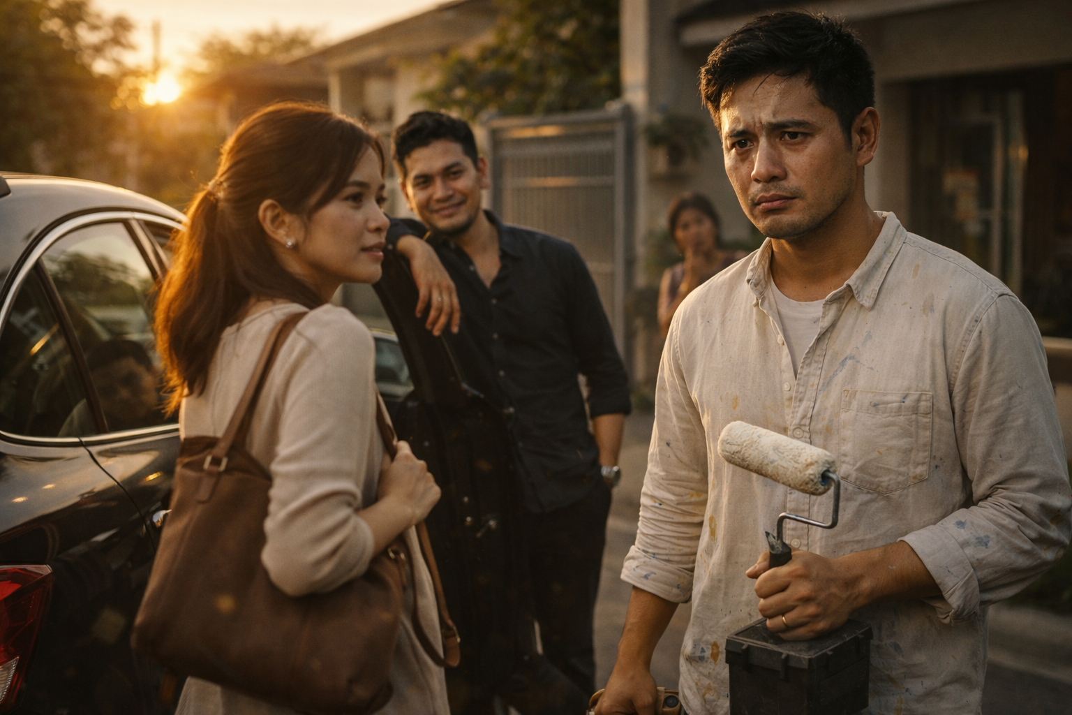 Sa harap niya, si Liza—ang asawa niyang dati niyang inuuwian kahit pagod, kahit amoy thinner ang kamay—ngayon naka-ayos na, may bag na nakasabit sa balikat, at may mga salitang hindi pa sinasabi pero ramdam na agad. Sa tabi ni Liza, may lalaking nakasandal sa kotse, nakangiting kampante, parang ang hangin sa paligid ay pag-aari niya. At sa likod, may isang babae sa gate na nakatingin, tahimik, parang testigo sa isang eksenang matagal nang hinihintay ang ending.